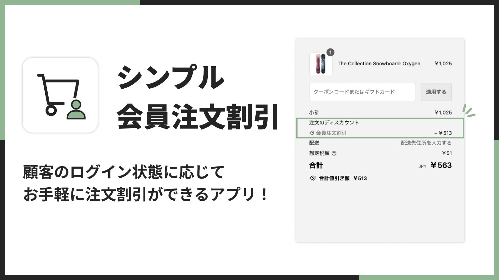 「シンプル会員注文割引|お手軽ログインセール設定」は、Shopify ストアで顧客のログイン状態に応じてお手軽に注文割引ができるアプリです。