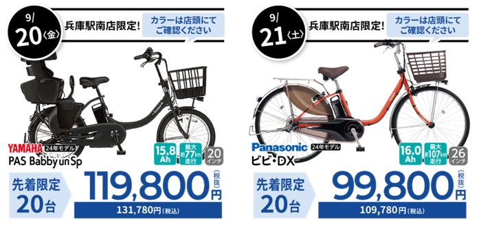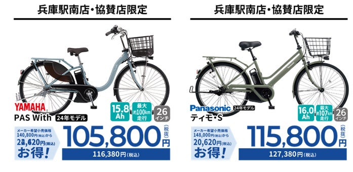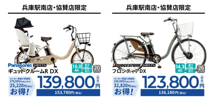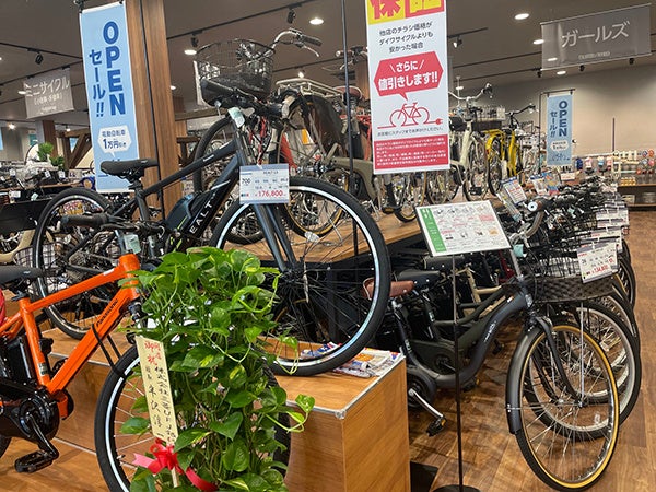 各種電動アシスト自転車に関してはWebサイト(https://www.daiwa-cycle.co.jp/feature/open_open_hyogoekiminami)よりクーポンをご持参いただくと10,000円(税込)引で販売をさせていただきます。(クーポン利用については条件がございますので、クーポン券の注記をご確認の上ご利用願います。)