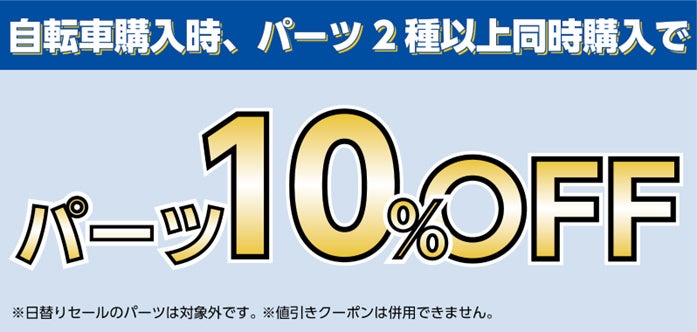 自転車購入時、追加パーツを2種類以上同時購入いただくとパーツを10%OFFでお買い求めいただけます。お買い物に便利な後ろカゴや、法改正による努力義務化で注目の高まるヘルメットをお得に購入できるチャンスです。この機会に是非お立ち寄りください。