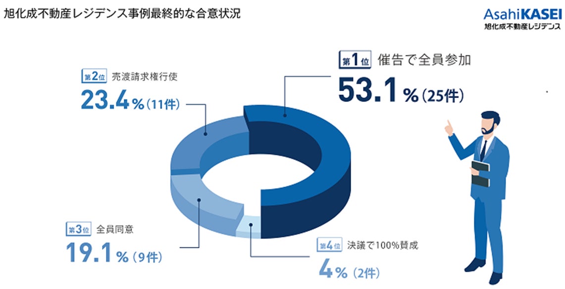 建替え決議の結果では、「当初は全員賛成とならなかったマンションにおいても催告を行うことで結果的に全員同意に至った」というケースが25件と半数以上を占めます。