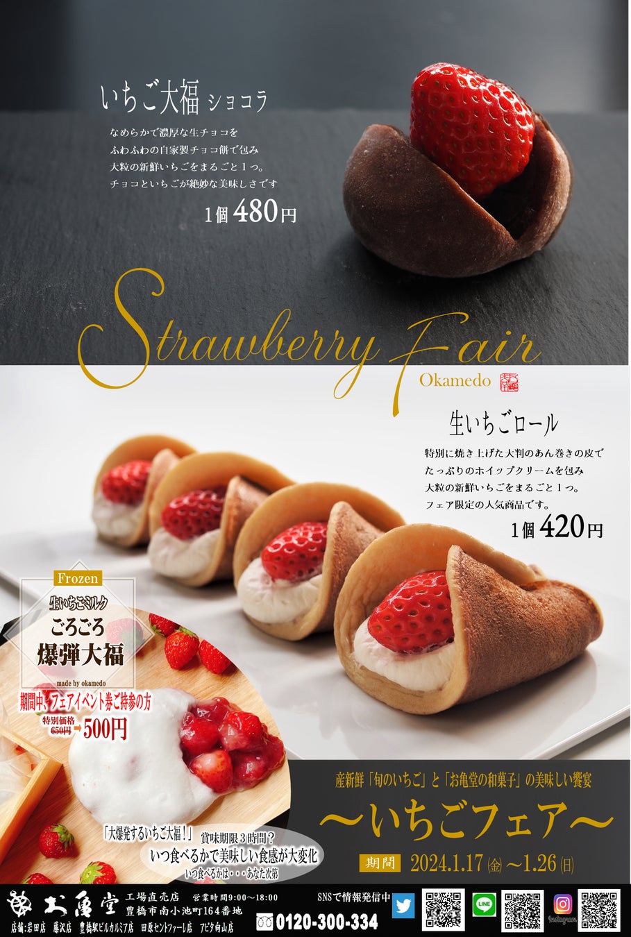 愛知県三河地域で70年以上の永きにわたりご愛顧いただいている老舗和菓子店、株式会社お亀堂(本社所在地:愛知県豊橋市、代表取締役:森貴比古)は、2025年1月17日~26日までお亀堂直営店でいちごフェアを開催します。