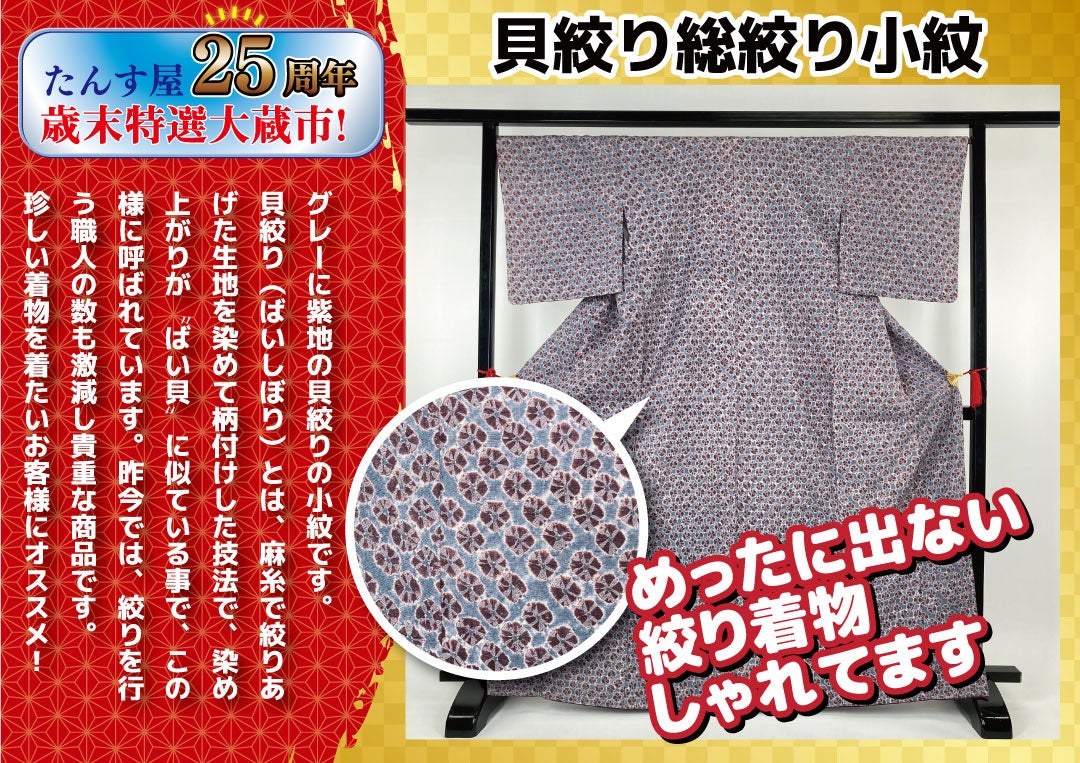 今回発表になったのは、貝絞り総絞り小紋、笹尽くし文様「お召」、型染+絞り「小紋」などの着物が計7点。いずれも、値の張るお品、希少性が高いお品となっております。すべて一点限りとなりますので、ぜひ会場へ足をお運びください。