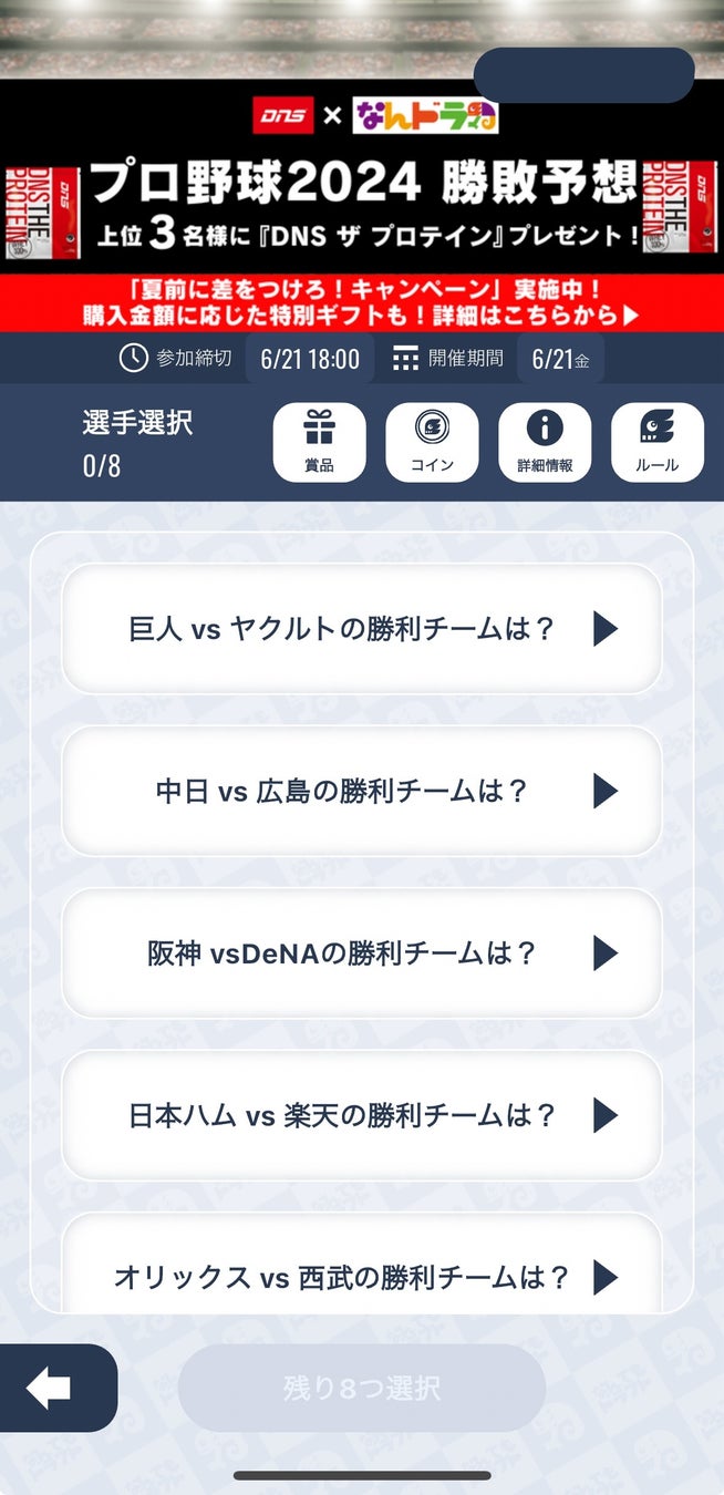 6月21日(金)〜23日(日)のプロ野球の勝敗を予想!毎日の成績で1位〜3位の3名様に『DNS ザ プロテイン』(630g)をプレゼント!