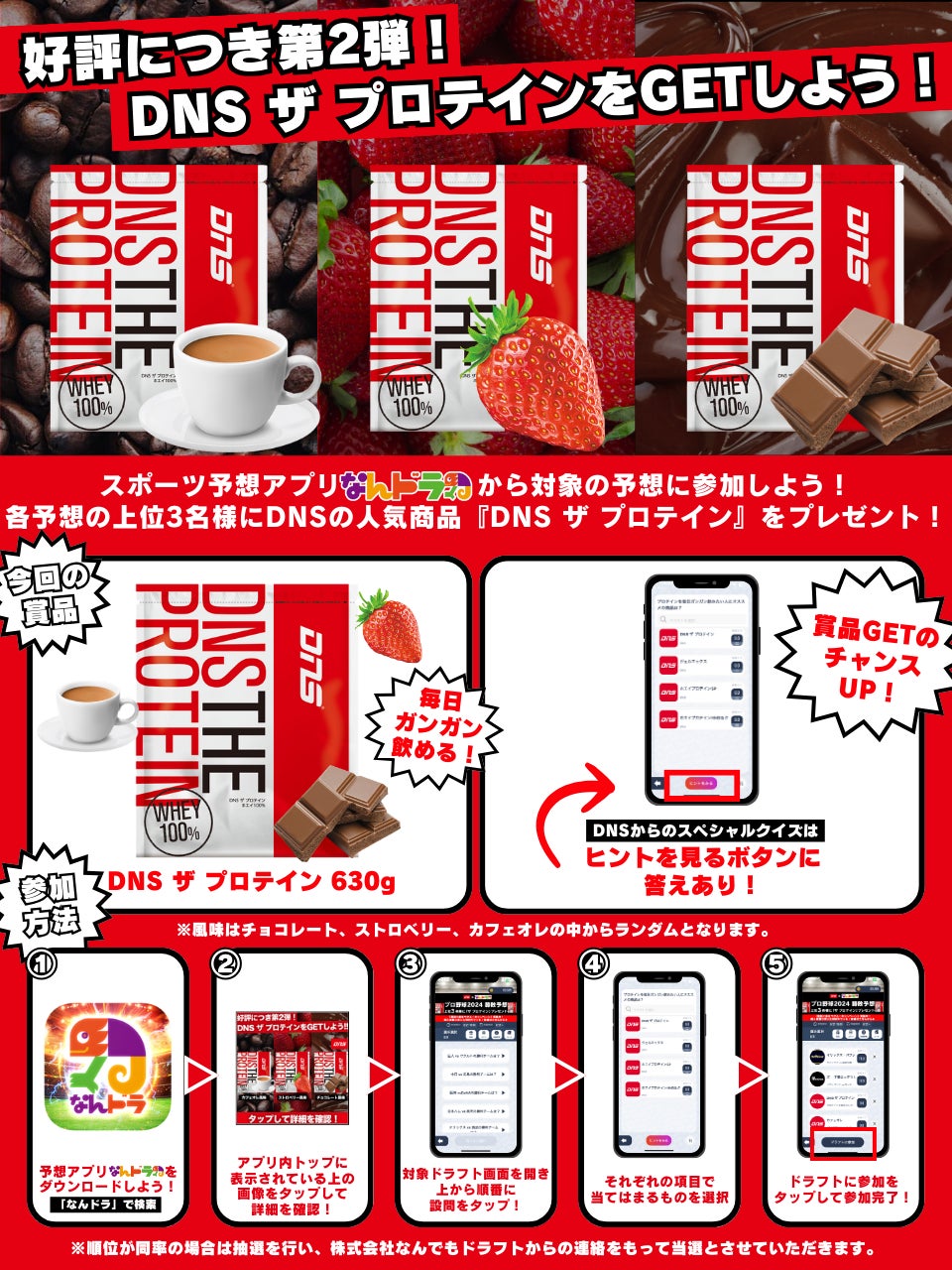 対象期間中に開催されるプロ野球公式戦の勝敗予想と、DNSに関するクイズやアンケートの回答いただき、毎日の予想成績で1位〜3位となった3名様に、身体づくりに重要な必須アミノ酸が豊富に含まれるホエイたんぱく質を100%使用したプロテイン『DNS ザ プロテイン』をプレゼントします。