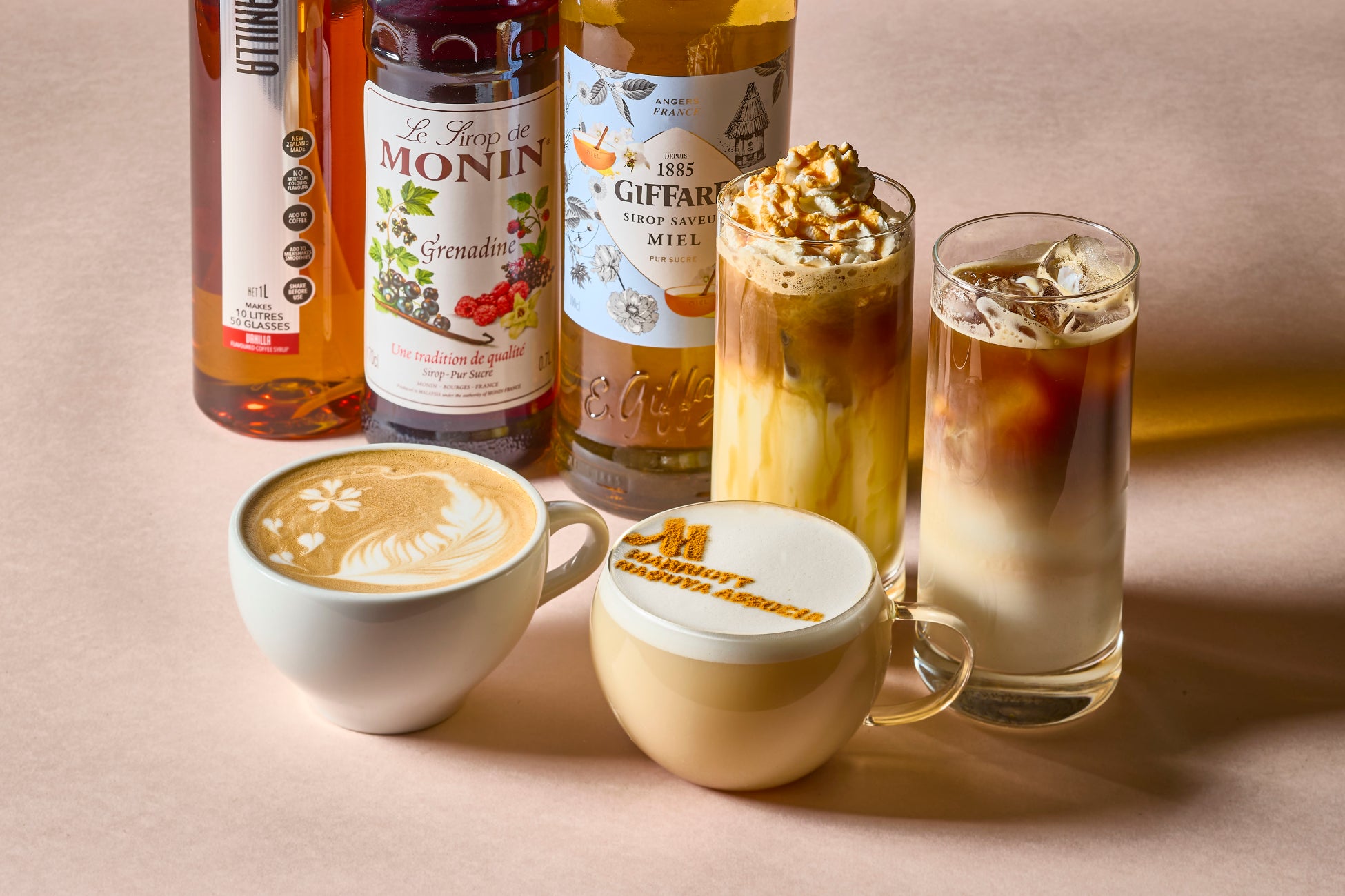 とうもろこしの優しい甘みが広がる「コーン茶ラテ」や「塩キャラメルラテ」の期間限定ドリンクに加えて、お好みのフレーバーシロップでつくるアイスフレーバーラテ、定番のカフェラテも取り揃えています。
