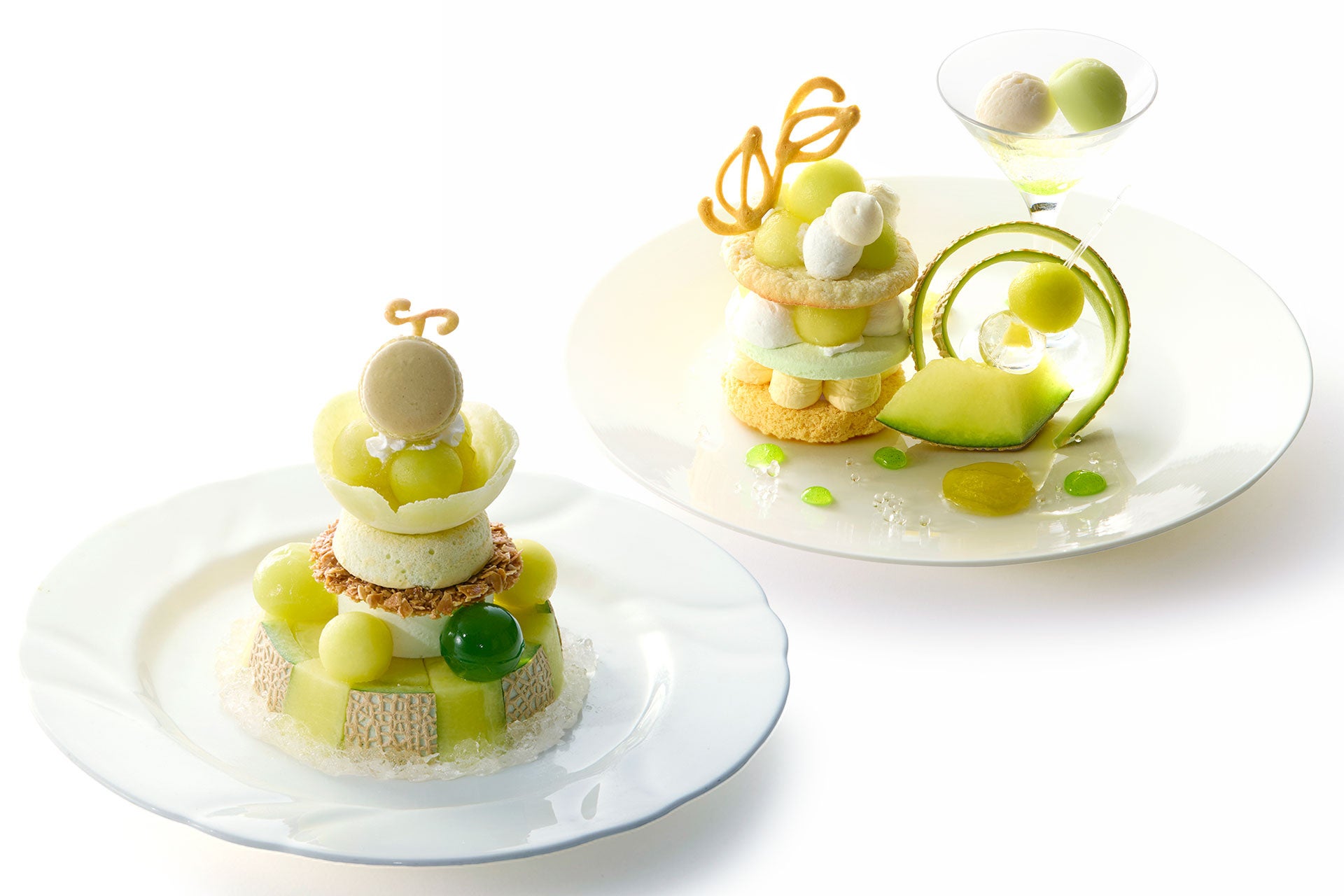 抹茶クランチチョコやメロンマスカルポーネ、フロランタン、メロンチーズスフレなどを重ね、トップにメロンをモチーフにしたマカロンを飾りました。フルーティーな香りの白ワインゼリーは、360°敷き詰めたマスクメロンの高貴な香りにペアリングしています。