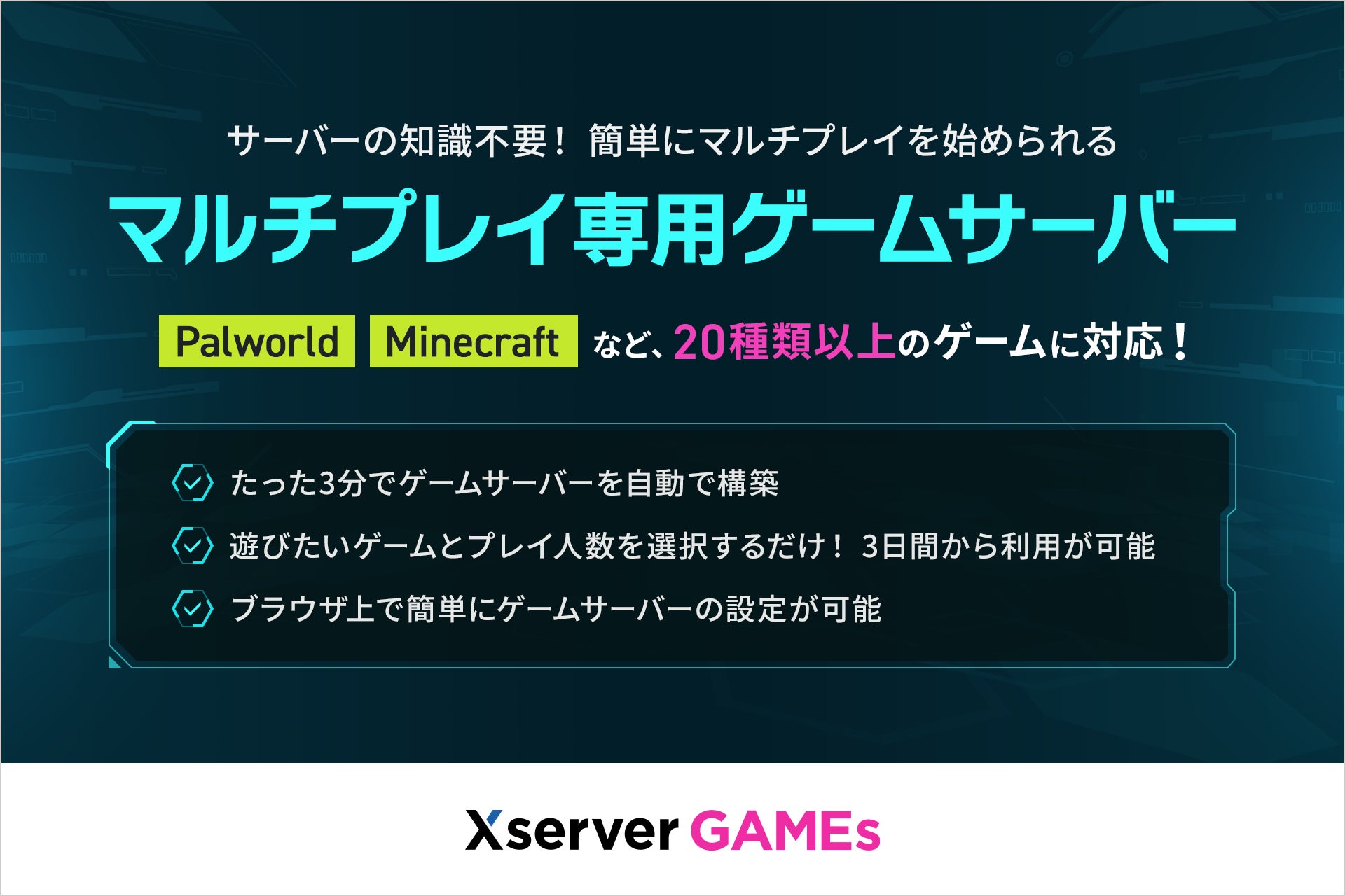 エックスサーバー株式会社(所在地:⼤阪市北区、代表取締役:⼩林 尚希)は、2024年6⽉27⽇、サーバーの知識不要で簡単にマルチプレイが始められるマルチプレイ専用ゲームサーバー『Xserver GAMEs』をリリースしました。また、それにともない、2024年8⽉22⽇まで「リリース記念キャンペーン」を実施いたします。
