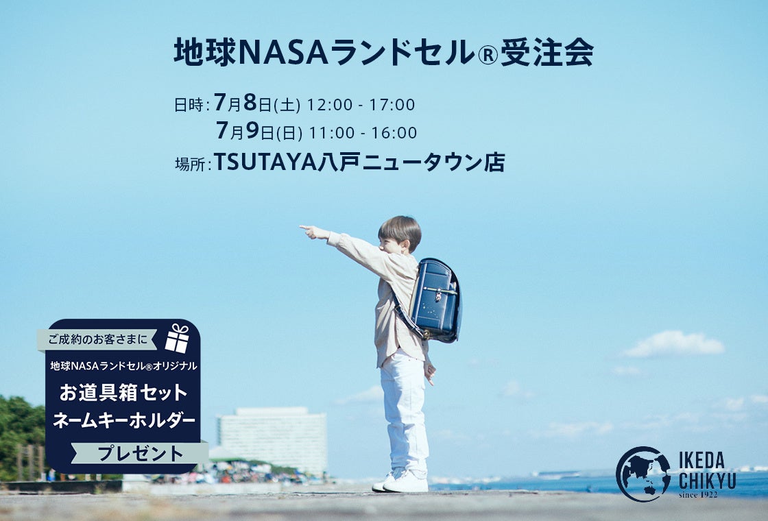 ランドセルの企画・販売を行う池田地球株式会社(本店:東京都港区:代表取締役 村尾光一)は、7/8(土)~7/9(日)の2日間限定で青森県八戸市の「TSUTAYA八戸ニュータウン店」にて「地球NASAランドセル®受注会」を開催いたします。