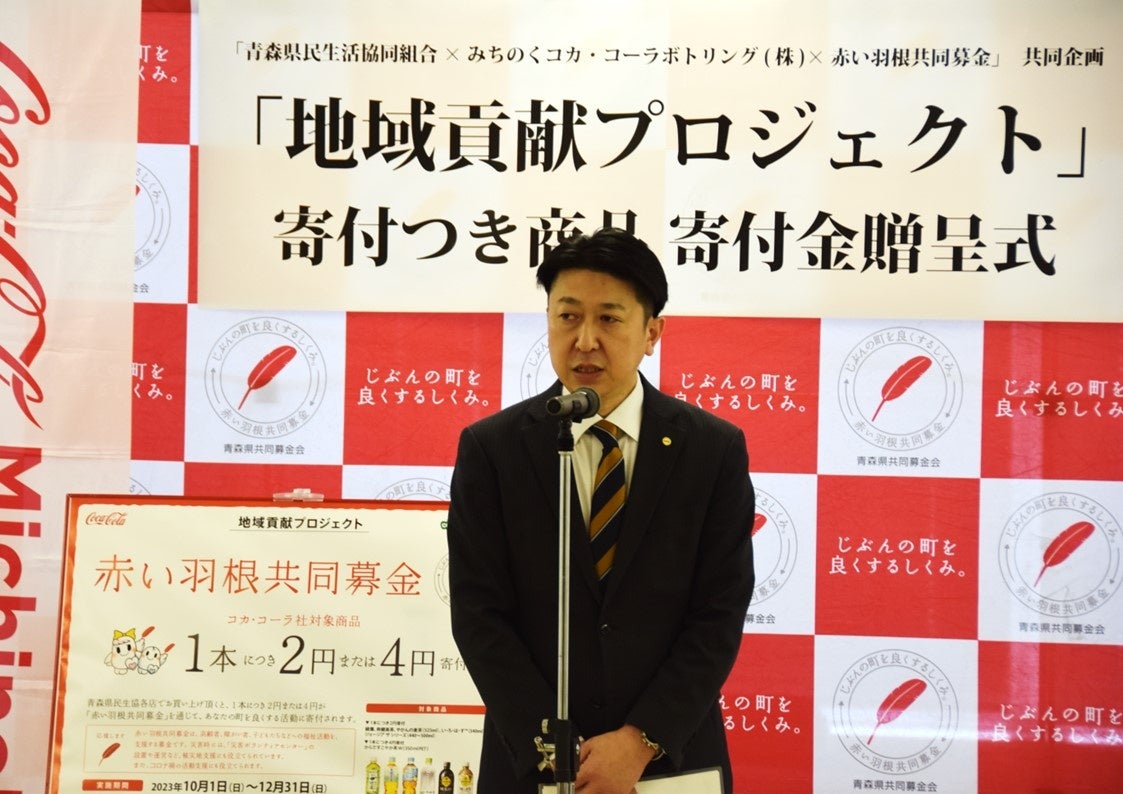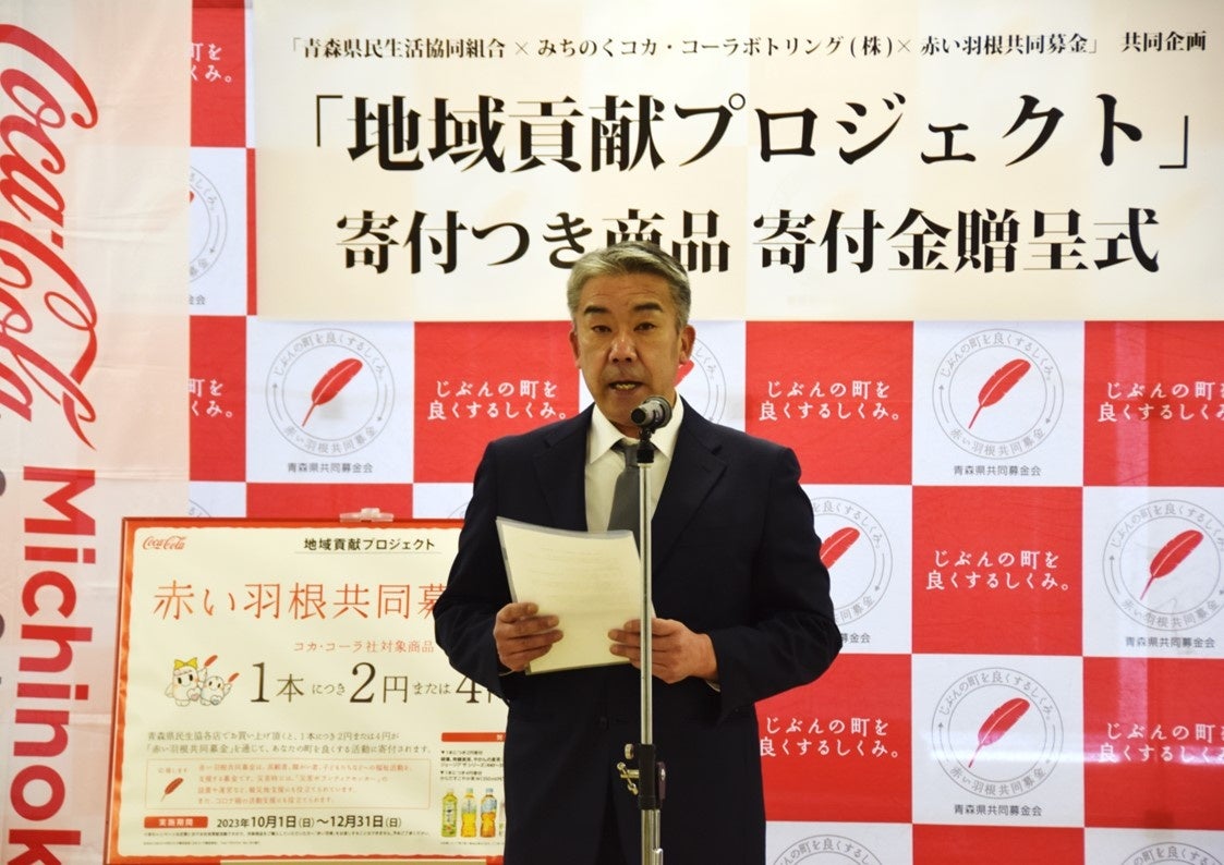 「今年も地域貢献プロジェクト寄付金贈呈式を開催できたことに感謝申し上げます。今年は過去最高の販売本数実績をつくることができ、大変うれしく思います。当生協といたしましては、青森県民の皆様の豊かな暮らしと、地域経済・社会の発展を目指し、今後もこうした活動に積極的に参加させていただきたいと思います。」
