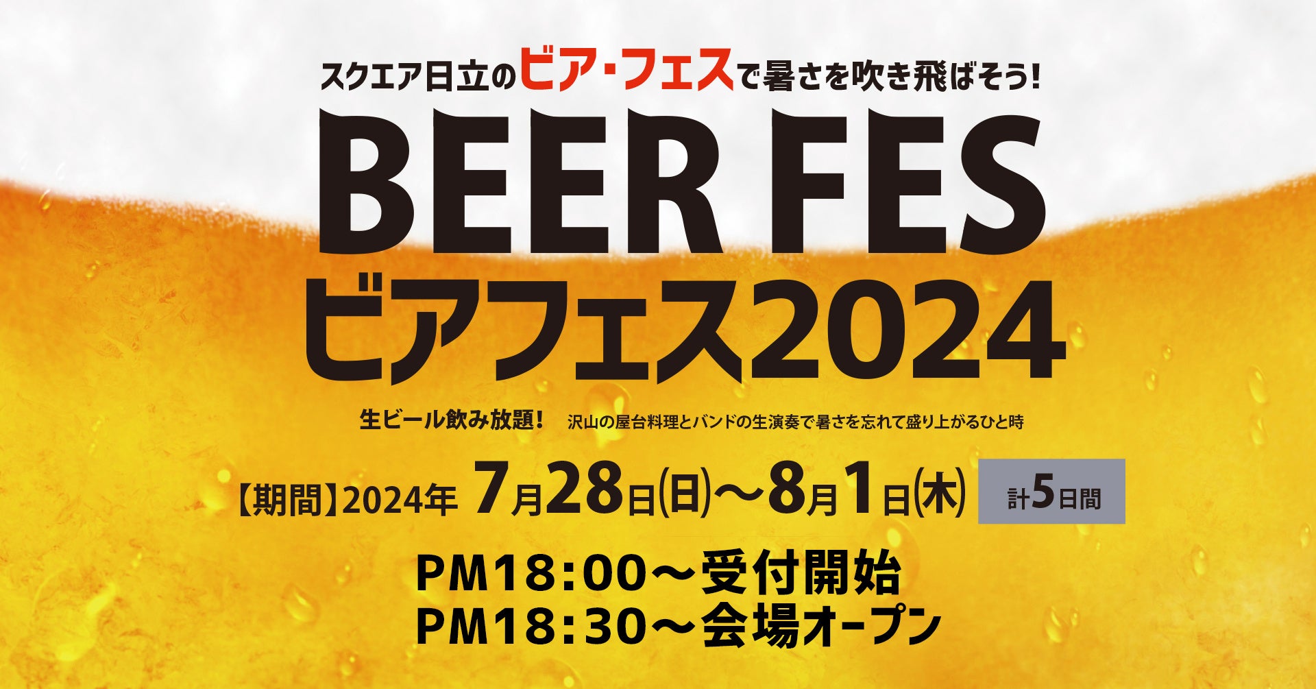 まるで海に浮いているような感覚に陥る景色が撮れる駅として近年人気の日立駅から徒歩2分にあるホテルテラスザスクエア日立(茨城県日立市/ 副総⽀配⼈:城⼾康/ 客室:121室)では、ビール&アルコールが飲み放題&屋台料理で楽しむ『ビアフェス2024』を開催いたします。今回、4年ぶりにコロナ前同様マスクの規制なしの開催。ステージの周りにダンススペースも準備いたします!