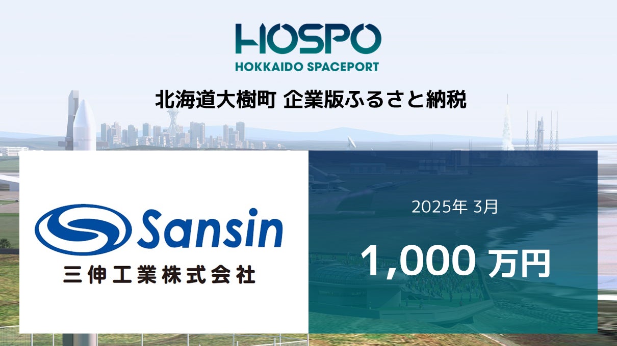 民間にひらかれた商業宇宙港「北海道スペースポート(HOSPO)」を運営する北海道大樹町(町長:黒川豊)とSPACE COTAN株式会社(本社:北海道広尾郡大樹町、代表取締役社長兼CEO:小田切義憲)は、三伸工業株式会社(本社:兵庫県神戸市、代表取締役社長:加地重久)より、1,000万円の企業版ふるさと納税の寄附をいただいたことをお知らせします。