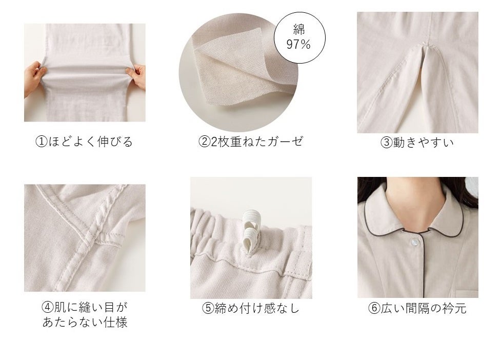 素材は①ほどよく伸びるダブルガーゼ。寝返りをうった時のつっぱり感を軽減します。②2枚重ねたガーゼが空気を含むのでとっても軽やかな着心地です。また、ポリウレタン糸を芯に綿糸を巻き付けた糸を使用しているので、肌にあたる部分は綿でやさしくやわらかな感触に。さらに③股下の継ぎ目は前側にずらすなど動きやすさを追求した立体パターンや仕様で、腕や脚の動きを邪魔しません。④折り伏せ縫いで肌に縫い目が当たらず、肌を刺激しにくく敏感肌の方にもおすすめです。⑤ウエストゴムは2本通しで、締め付け感なしに。⑥第一ボタンを閉めても苦しくないよう、広い間隔の衿元に仕上げました。