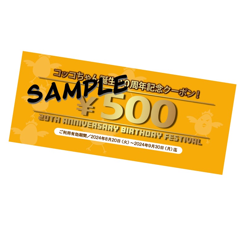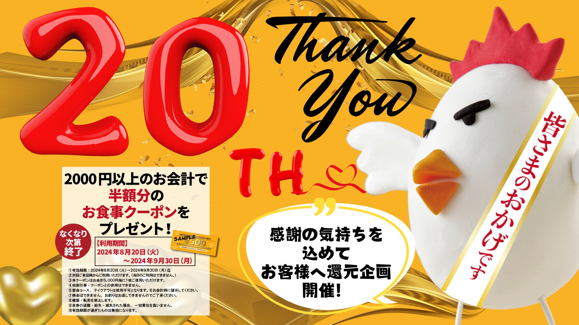 ありがとう20周年!感謝を込めたキャンペーン第1弾「いただきコッコちゃん」全店で「半額分キャッシュバッククーポン」プレゼントキャンペーンを8月9日(金)から開催!人もお財布も笑顔に!なくなり次第終了!