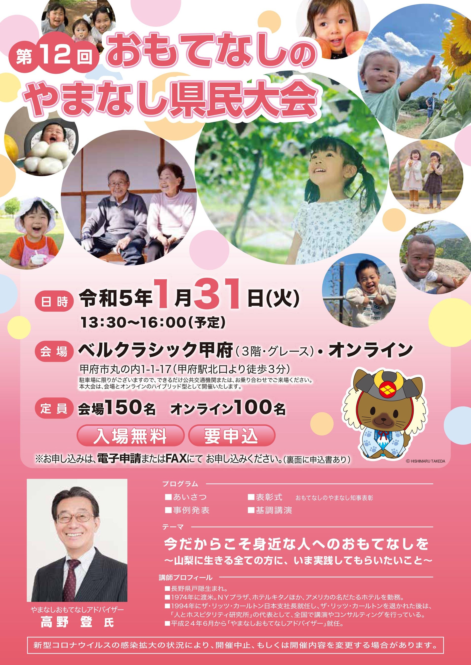 その一環として、毎年2月1日から7日を「おもてなし推進週間」と定め、同週間の始まりを前に「おもてなしのやまなし県民大会」を開催して参りました。本年令和5年は、「第12回おもてなしのやまなし県民大会」を以下の通り、1月31日(火)にベルクラシック甲府にて開催します。