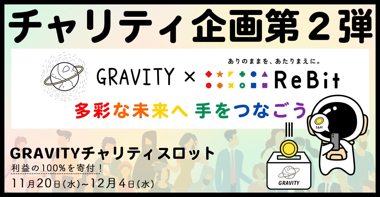 「気楽に話せる、やさしいSNS」を目指すグラビティは、今年の8月に、未来を担う子供たちのために、認定特定非営利活動法人カタリバ様へオンラインでのチャリティキャンペーンを行いました。今回も理念に基づき、第2弾として、学校・企業・行政・福祉でLGBTQやダイバーシティに関する支援活動を行う認定NPO法人ReBit様へのチャリティキャンペーンを実施いたします。