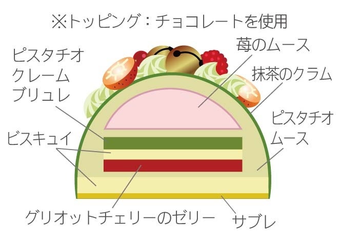 ピスタチオと苺のムースを重ね、抹茶クラム(抹茶スポンジを細かく削ったもの)で苔玉のように包みました。どんぐりと鈴のチョコレートを添えた、遊び心のある和のクリスマスケーキです。