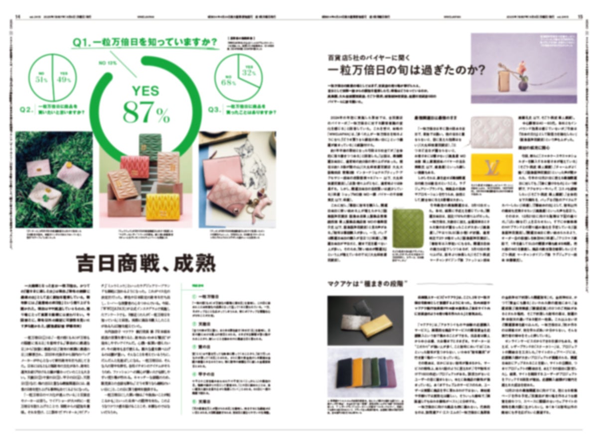第二特集では、一粒万倍日に代表される“吉日商戦”を取材しました。財布販売に絶大な販促効果のある“吉日商戦”ですが、財布以外にも商機がうかがえそうなジャンルをご紹介します。海外情報ページでは、ジョナサン・アンダーソンがウィメンズ&メンズのクリエイティブ・ディレクターに就任したことで話題の「ディオール(DIOR)」について、ビジネス上の戦略をデルフィーヌ・アルノー=クリスチャン ディオール クチュール会長兼CEOにインタビューしました。