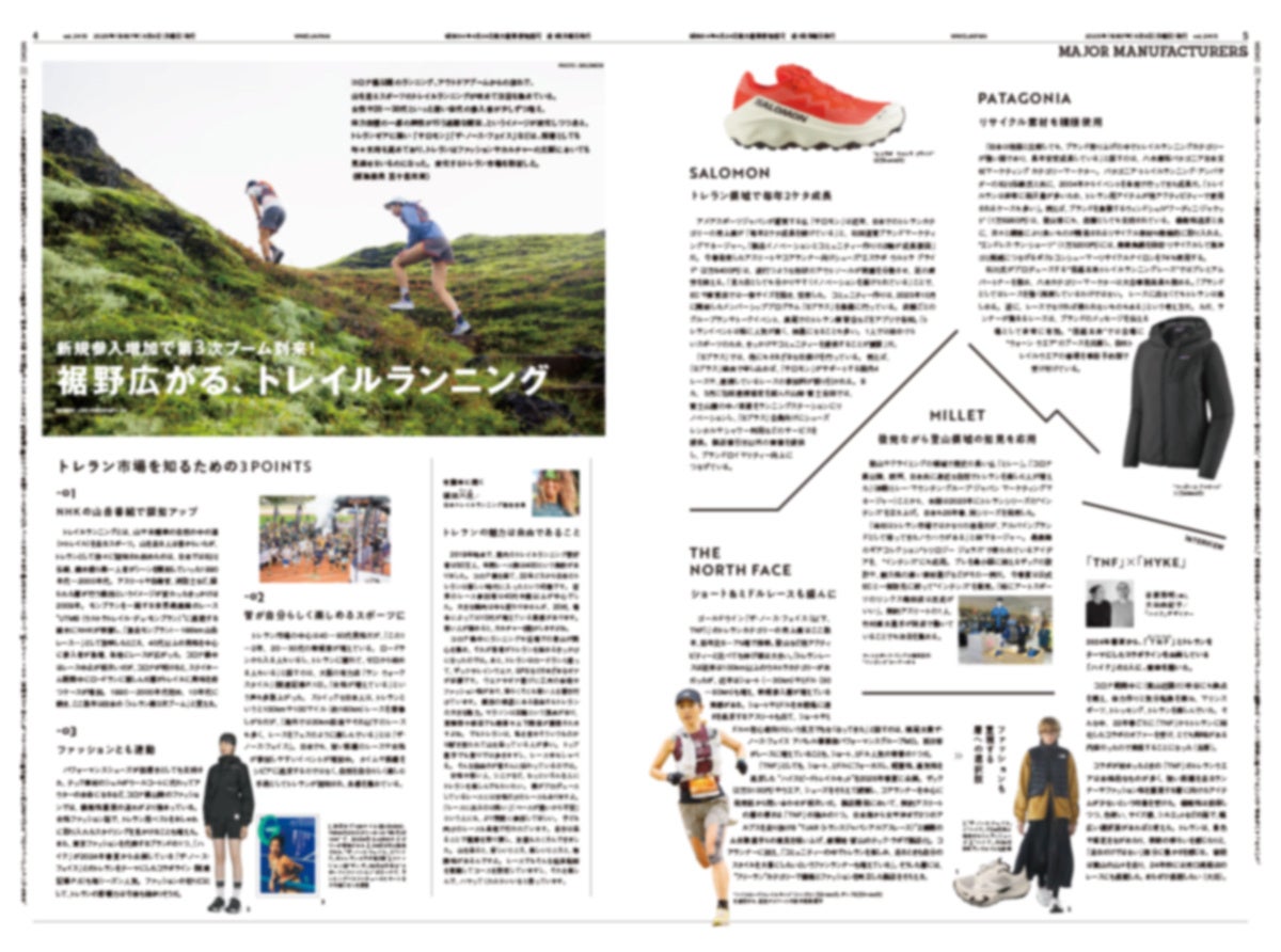 もちろん、「サロモン(SALOMON)」「パタゴニア(PATAGONIA)」「ザ・ノース・フェイス(THE NORTH FACE)」など、大手アウトドアブランドのトレランカテゴリーの商況も取材。表紙には日本のヒップホップのレジェンドであり、現在トレランに絶賛ハマり中というGAKU-MCさんが登場。トレランのどこに魅力を感じているのかや、ガクさん流の楽しみ方を聞きました。