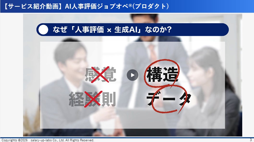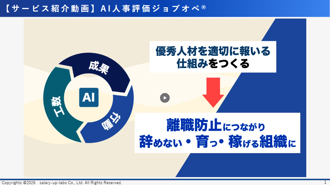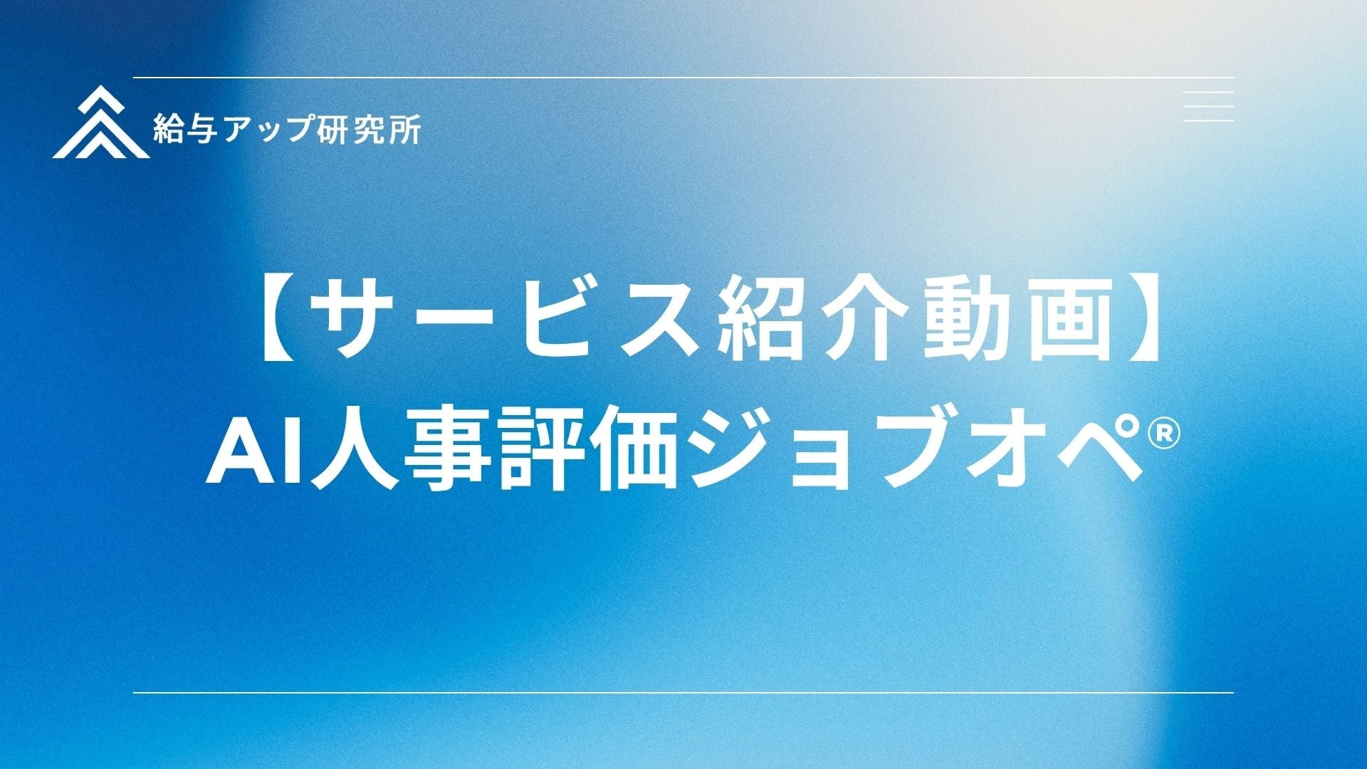 株式会社給与アップ研究所(本社:東京都渋谷区、代表取締役:高橋 恭介)は、AIを活用した人事評価制度構築支援サービス「AI人事評価ジョブオペ®」のサービス紹介動画を公開しました。