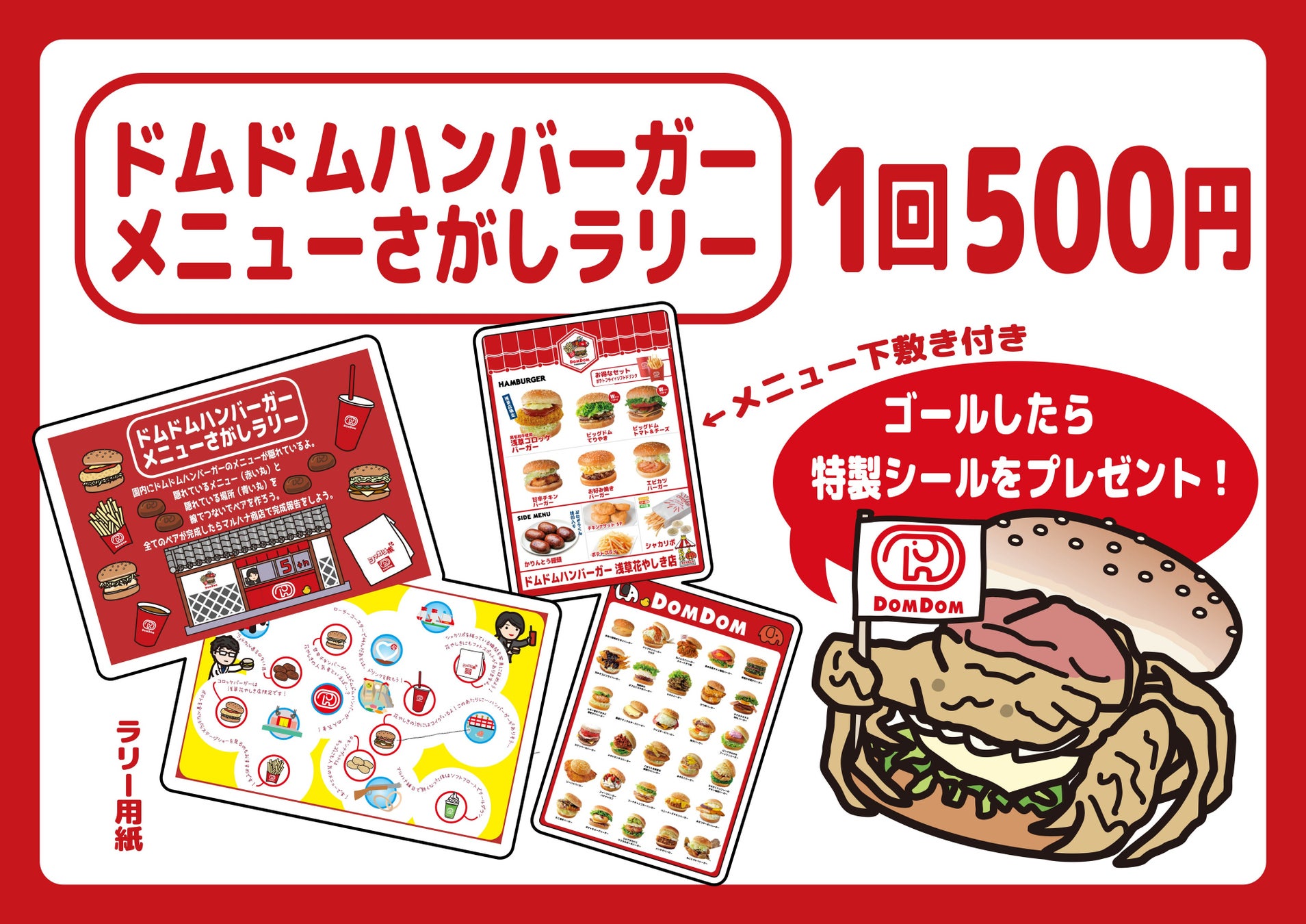 参加特典として、ドムドムハンバーガーのメニューデザインの下敷きをお渡しします。さらにクリアした方にはオリジナルステッカーを1枚プレゼントします。