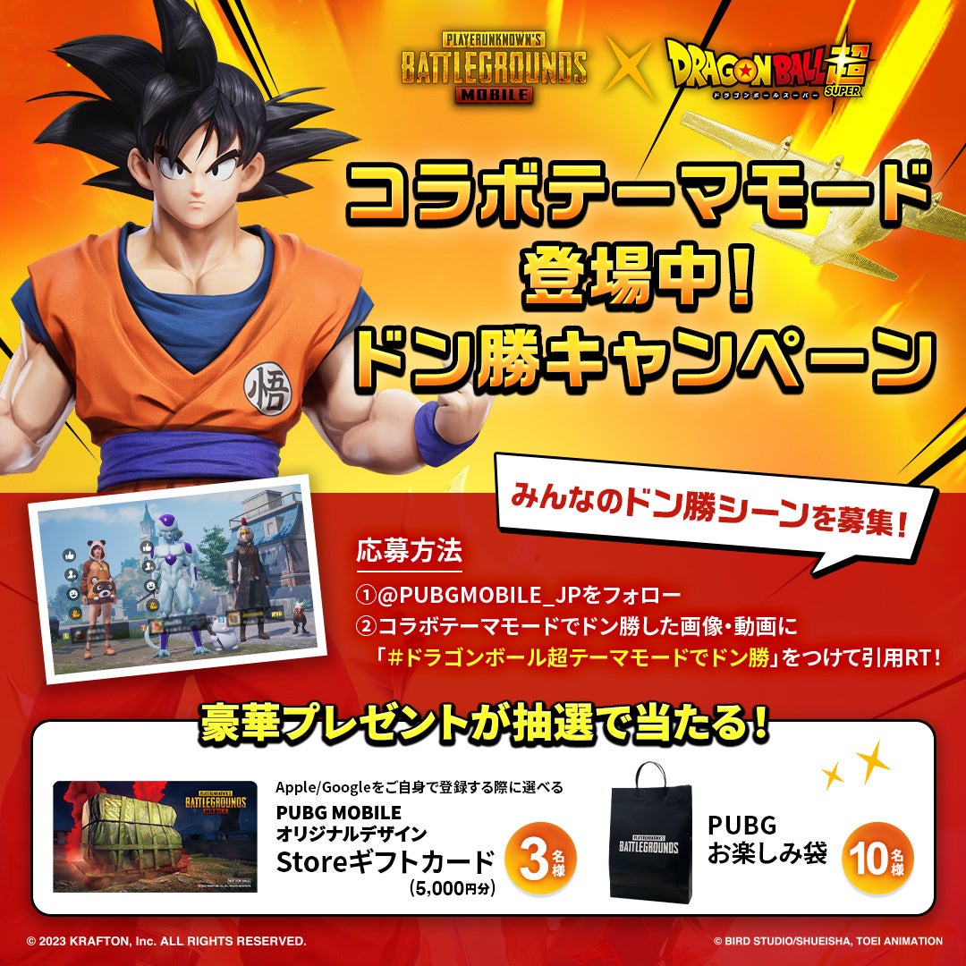 「ドラゴンボール超テーマモード」でドン勝したシーンを撮影してTwitterに投稿すると「PUBG MOBILE」 オリジナルデザインのStoreギフトカードやPUBGお楽しみ袋が当たるキャンペーンが開催中です。応募方法は、キャンペーンツイートを引用RTし、ハッシュタグ「#ドラゴンボール超テーマモードでドン勝」をつけて投稿すると応募できます。応募期間は8月1日~9月4日までです。