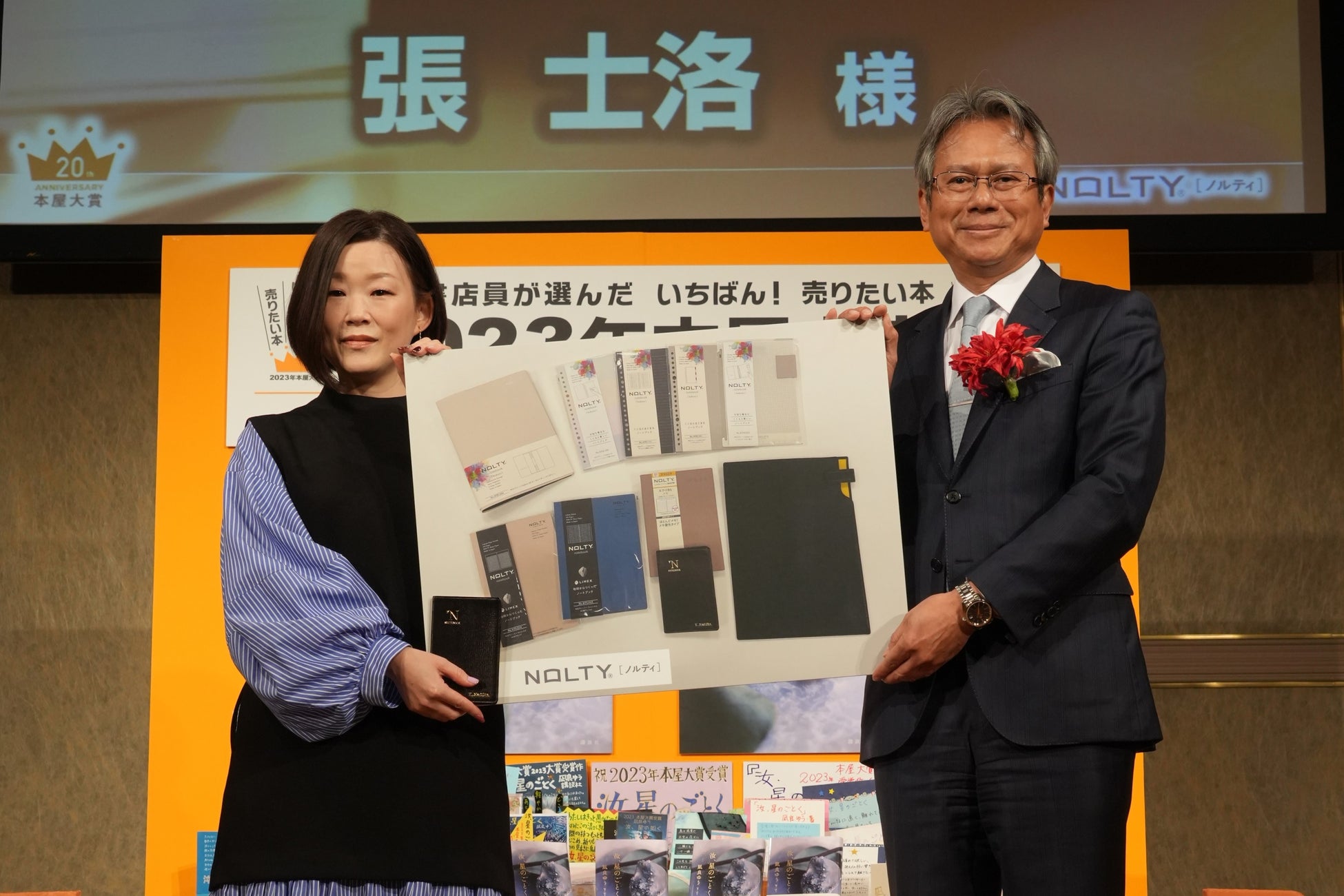 本年は凪良ゆう氏の『汝、星のごとく』(講談社)が大賞を受賞し、当社代表の張より、お祝いの言葉と共に、副賞として「NOLTY能率手帳ゴールドメモティ」「NOLTYノートブック各種」「レザーファイル」「4月始まり NOLTY手帳」を贈呈しました。