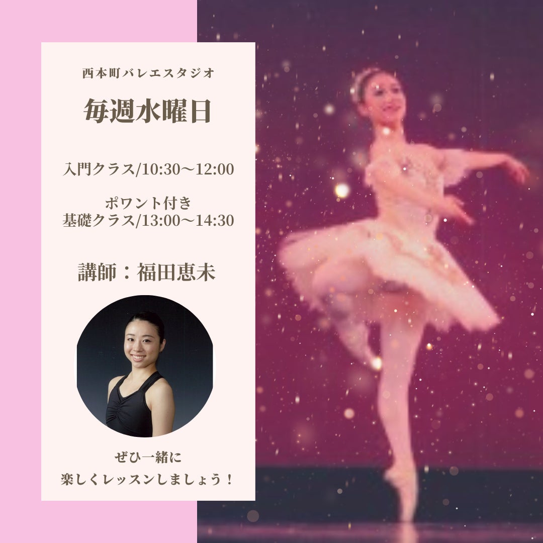 毎週水曜日 福田恵未先生 が新たな講師として大人バレエの皆さまを熱心に指導いたします。