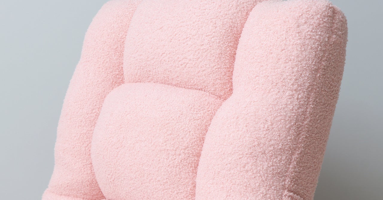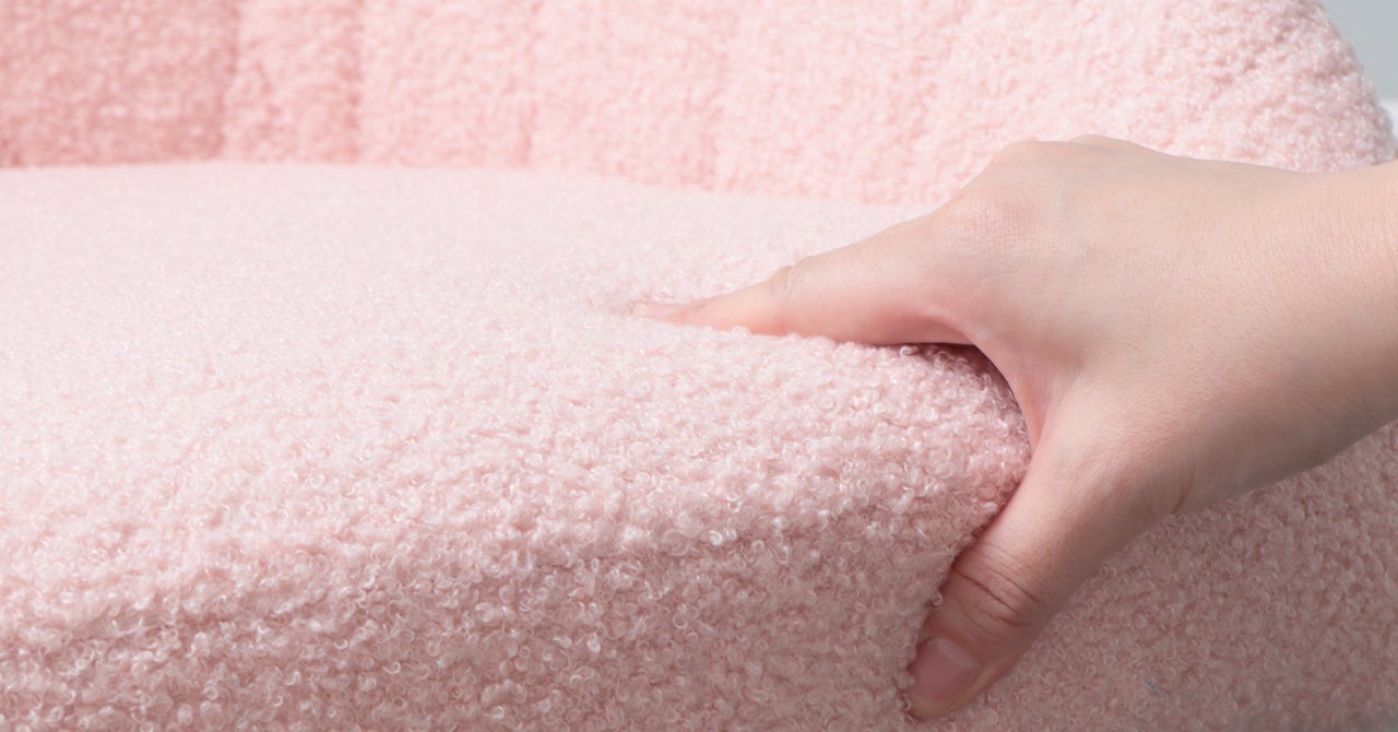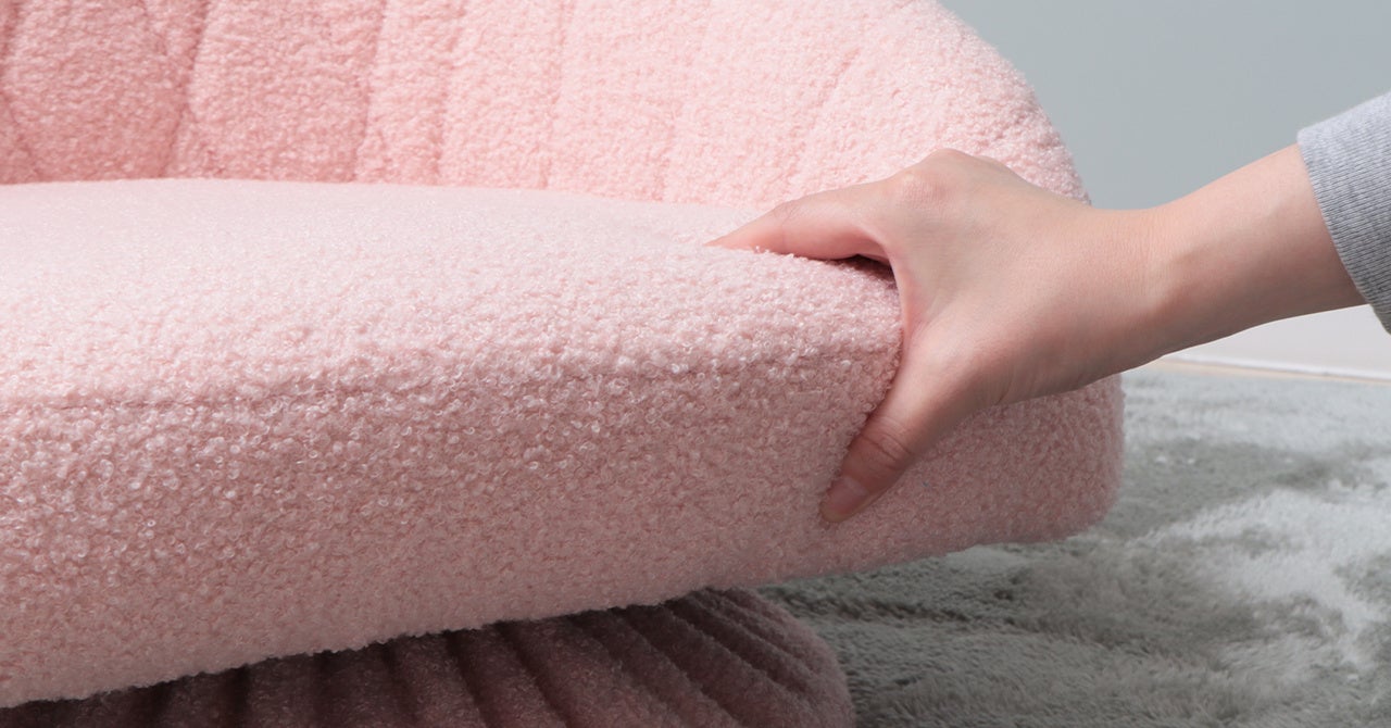 2種のフロアチェアで使用したふわもこの張地は、海外インテリアでも人気のブークレ調生地を採用。表面がモコモコと細かい泡のように見えるのが特徴です。ブークレ(bouclé)とはフランス語で「輪」という意味で、布地の表面に糸の輪が出た織物または編地のこといいます。 ヤマソロで採用した生地の表面は「輪っか」ではなく、プードルやひつじのようにくるんとカールしているのが特徴です。お洋服などのひっかかりを心配しなくていいのが嬉しいですね。