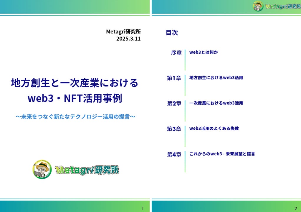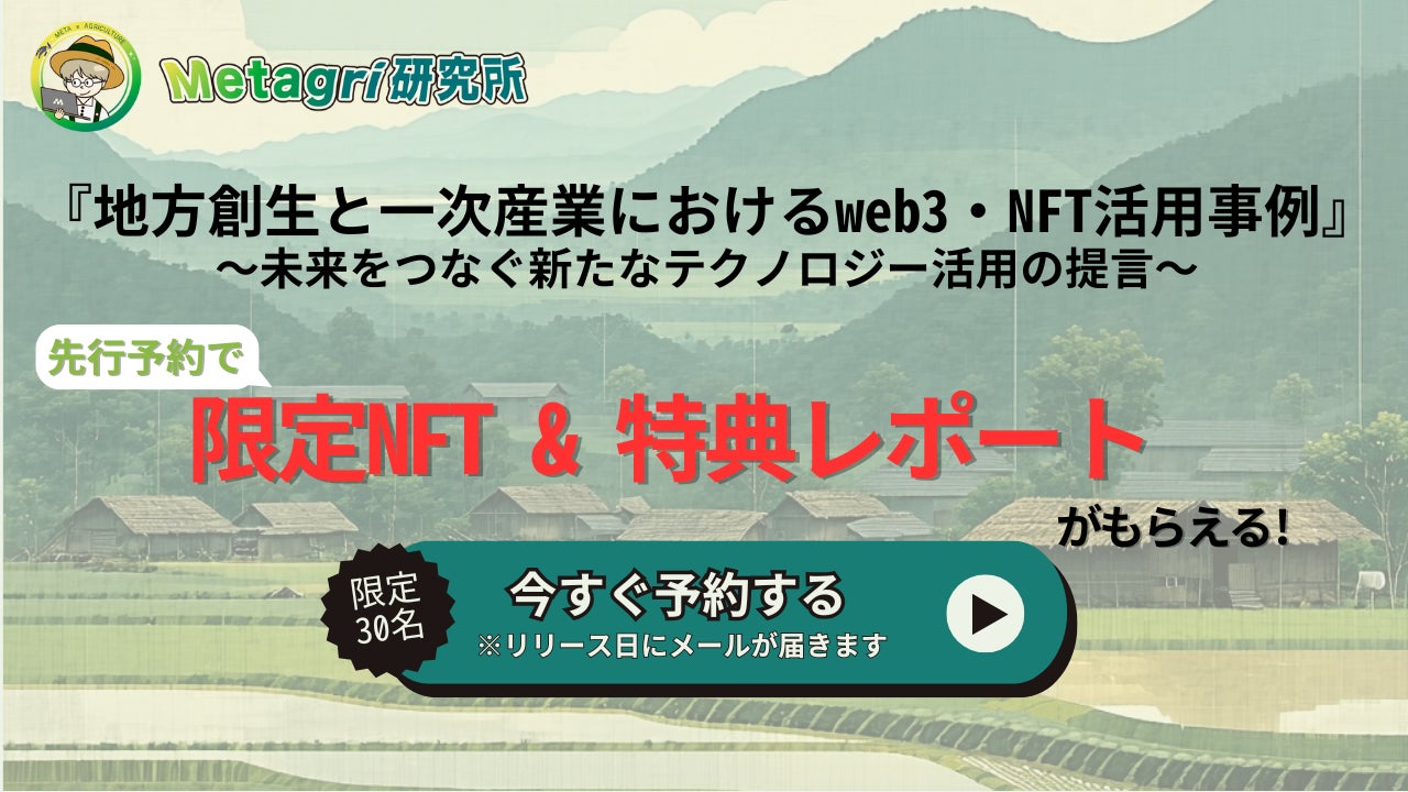 農業×web3を推進するコミュニティ、Metagri研究所(運営:株式会社農情人、本社:千葉県船橋市、代表取締役:甲斐雄一郎)は、設立3周年を迎える2025年3月11日(火)にリサーチペーパー『地方創生と一次産業におけるweb3・NFT活用事例 ~未来をつなぐ新たなテクノロジー活用の提言~』を公開します。公開に先立ち、先着30名様限定の先行予約を開始いたしました。早期予約特典として、限定NFTと地方自治体向けweb3導入特典レポートを無料配布いたします。