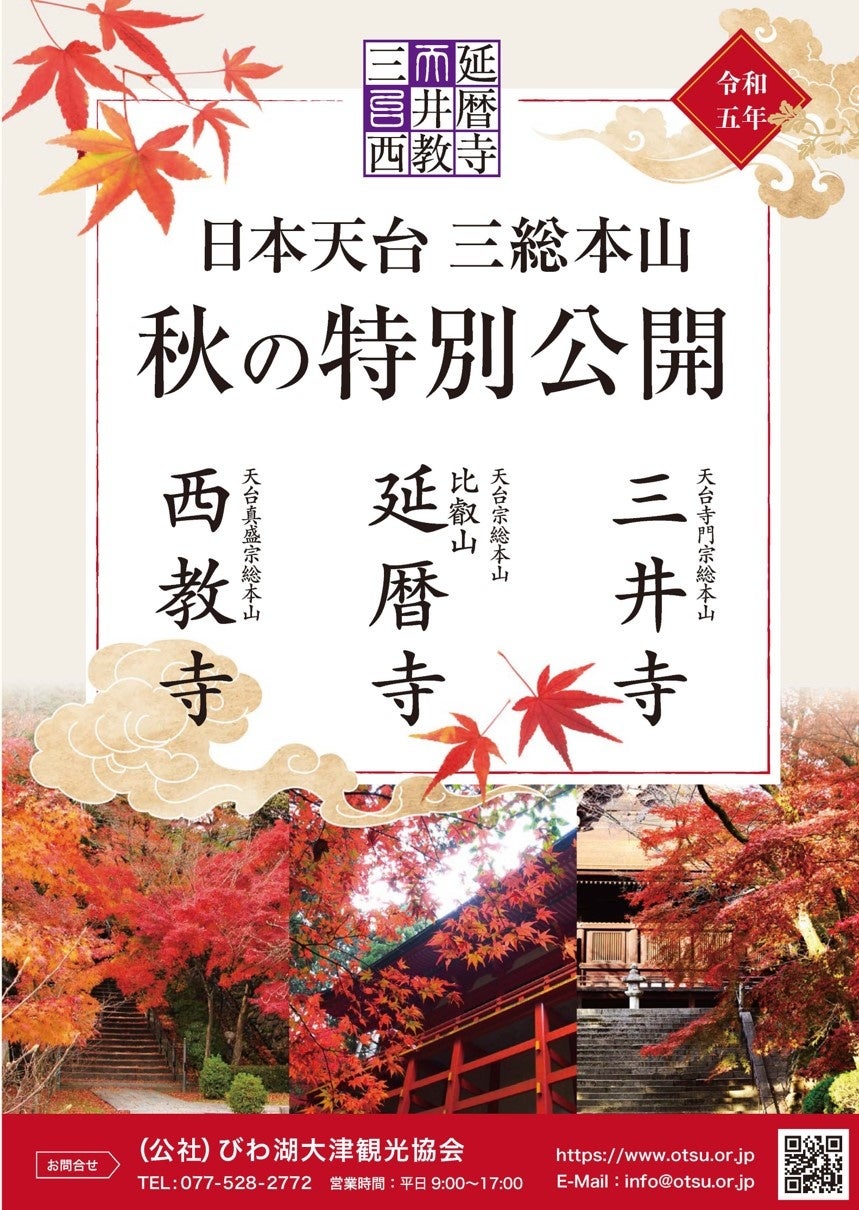日本一の雄大な琵琶湖を眼下に望める景勝の地でもあり、静寂の中で四季折々を感じられる自然が、訪れる人々を癒しの世界に誘うことのできるところ日本天台三総本山。 令和5年(2023年) 秋、限定の特別拝観や特別公開が行われる、比叡山『延暦寺』・長等山『三井寺』・戒光山『西教寺』の見どころが詰まったパンフレットとなっております