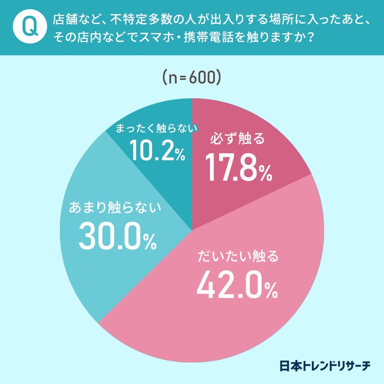 続いて、店舗などの不特定多数の人が出入りする場所に入ったあと、その店内などでスマホ・携帯電話を触るか聞きました。
