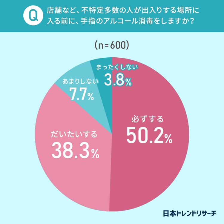 店舗などの不特定多数の人が出入りする場所に入る前に、手指のアルコール消毒をするか聞いたところ、以下のような結果になりました。