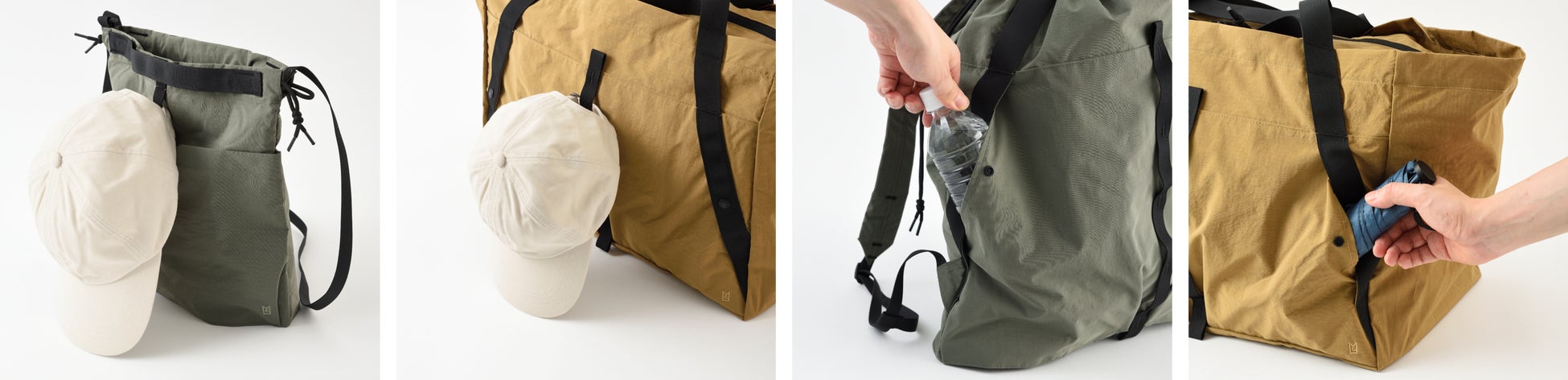 シンプルなフォルムに機能性を兼ね備えたデザインで、バッグ全体に施されたテープがアクセントに。2WAY仕様のため、使用シーンに合わせて持ち方を変えられます。バッグ外側にはペットボトルや折りたたみ傘を収納できるポケット、背面にはキャリーケースハンドルへ装着できるベルトを搭載。