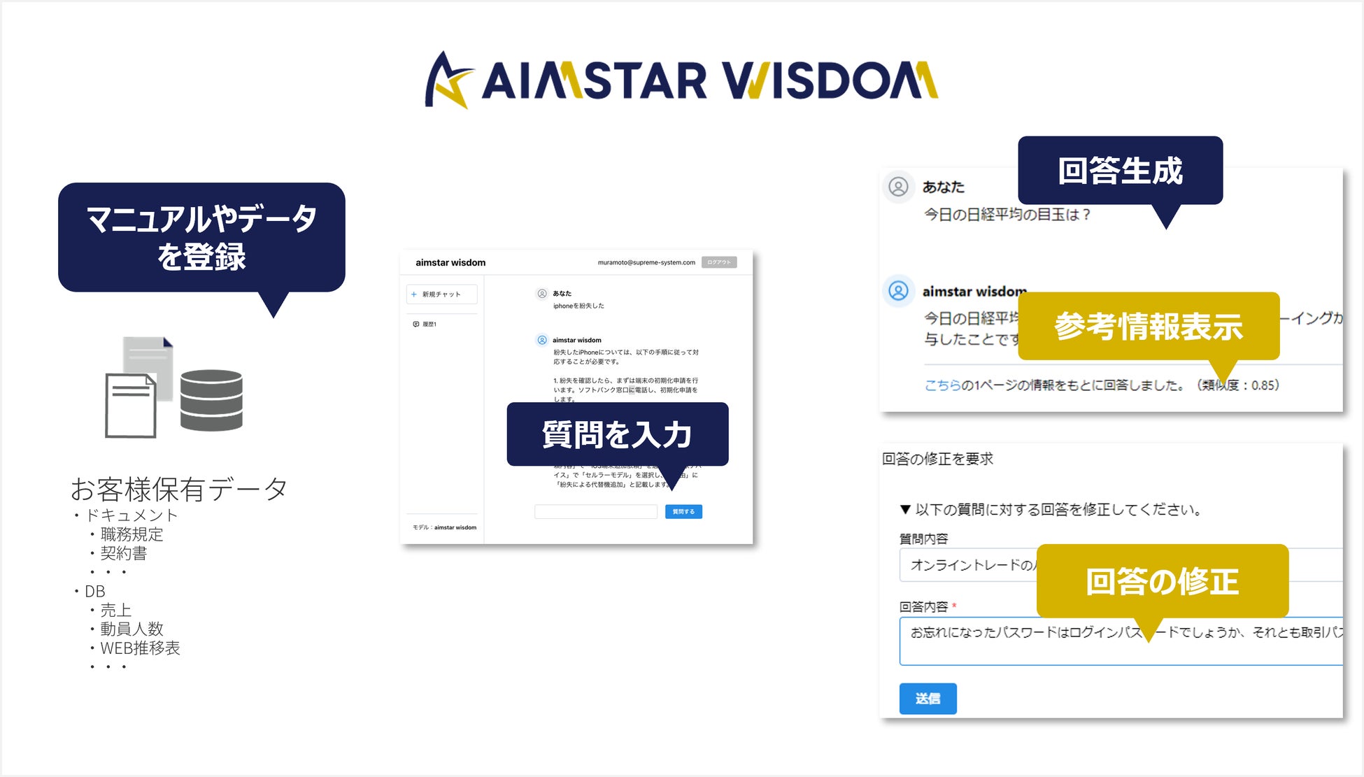 AIMSTAR WISDOMは、社内マニュアルなどのユーザー企業が保有するデータを元に、ユーザーの質問回答と文書検索を行うFAQ・ナレッジ検索システムです。