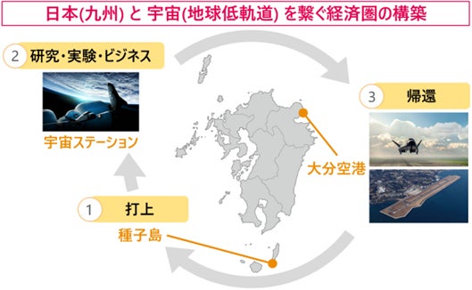 宇宙往還機を用いた日本での打ち上げ、宇宙ステーションへの輸送、日本への帰還により、新たな経済圏を構築します。また、大分空港の宇宙港化を実現し、日本およびアジアにおける宇宙ステーションと地上とのハブとして機能させ、地域創生および産業振興に寄与します。さらに、宇宙往還機の再突入・着陸、宇宙港に係る法制度の検討により、ルールメイキングへ貢献します。