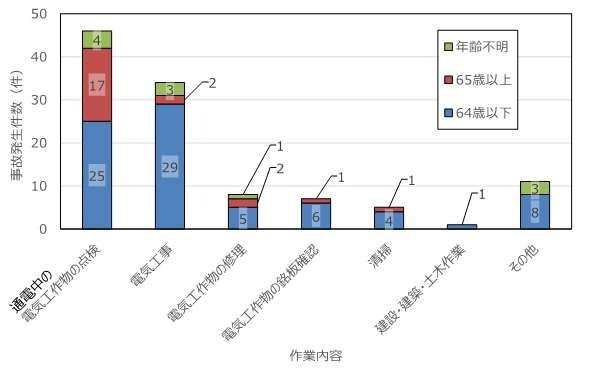 高齢作業者の皆様におかれましては、通電中の「電気工作物の点検」作業中の感電リスクが高いことに十分ご注意ください。