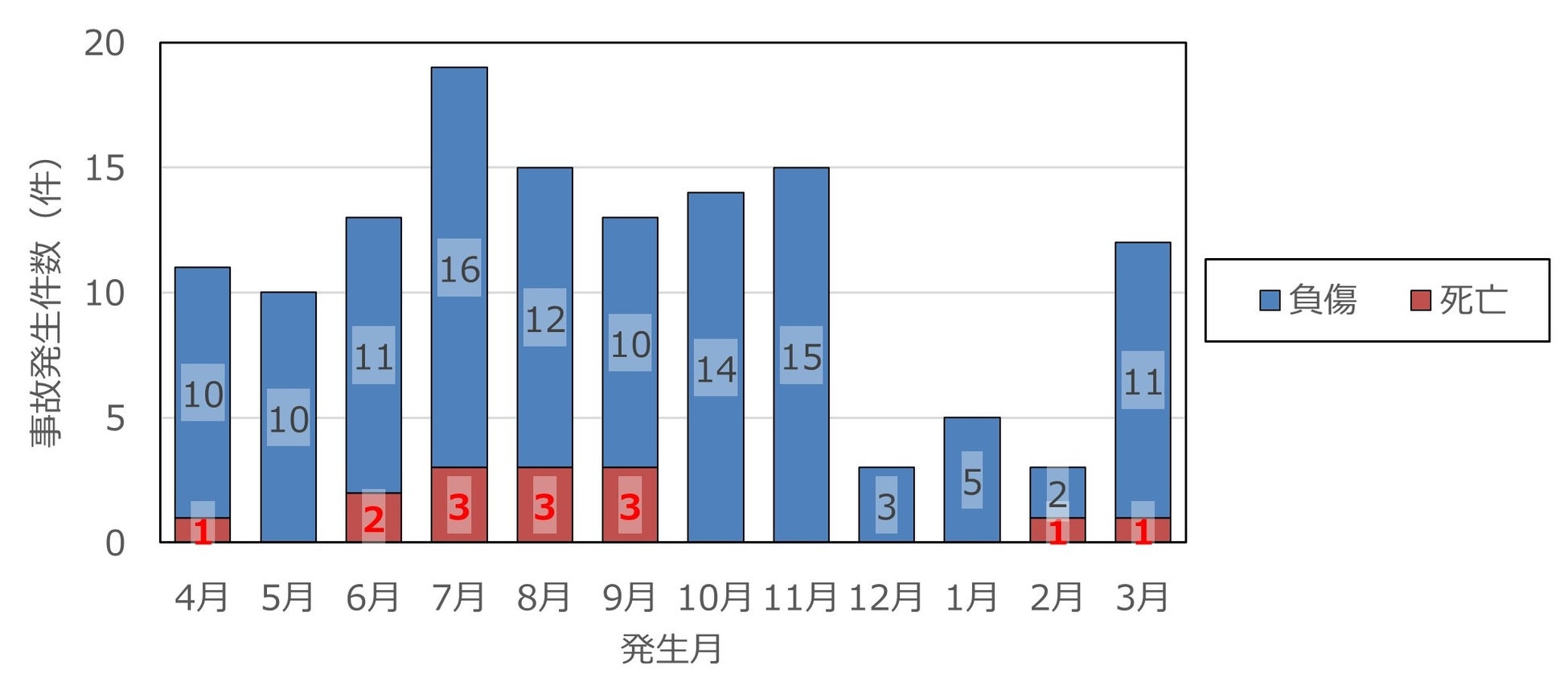 発生月別に見ると、6月から感電死傷事故が増加をはじめ、7月に最多となり、11月頃まで高い発生傾向が続いています。また、6月~9月の夏場においては、死亡事故も多く発生しております(図4、図5)。