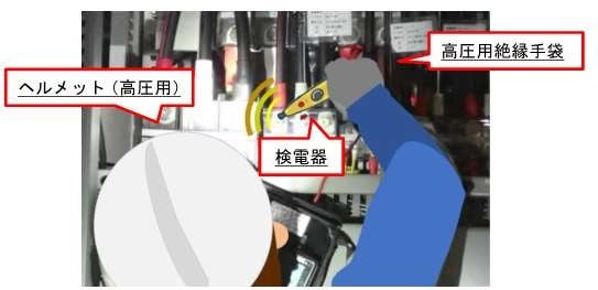 ① 検電の徹底 作業前に必ず検電を実施し、無電圧であることを確認してください。正しく検電をしていれば、防げた感電死傷事故も起こっています。常に検電器を所持してください。 ② 絶縁用保護具の着用 ・作業内容に応じた絶縁用保護具を正しく着用してください。併せて、肌の露出が少ない服装(長袖等)を着用してください。 ・作業前に必ず絶縁用保護具を点検し、異常の有無を確認してください。 ③ 作業手順の確認・遵守 ・作業内容や作業方法を正しく理解した上で作業を行ってください。 ・思いつきによる予定外作業は行わないでください。 |