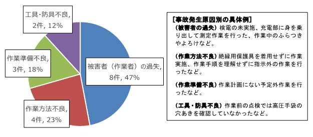 事故発生原因としては、「被害者(作業者)の過失」が最多(8件)であり、次いで、「作業方法不良」、「作業準備不良」、「工具・防具不良」となっています。具体的には、作業中の不注意(作業手順の確認不足、検電の未実施など)、作業手順違反(絶縁用保護具の未着用、充電部に身を乗り出して測定作業を行ったなど)、身体的異常(作業中のふらつき、よろけなど)などが挙げられます(図10)。