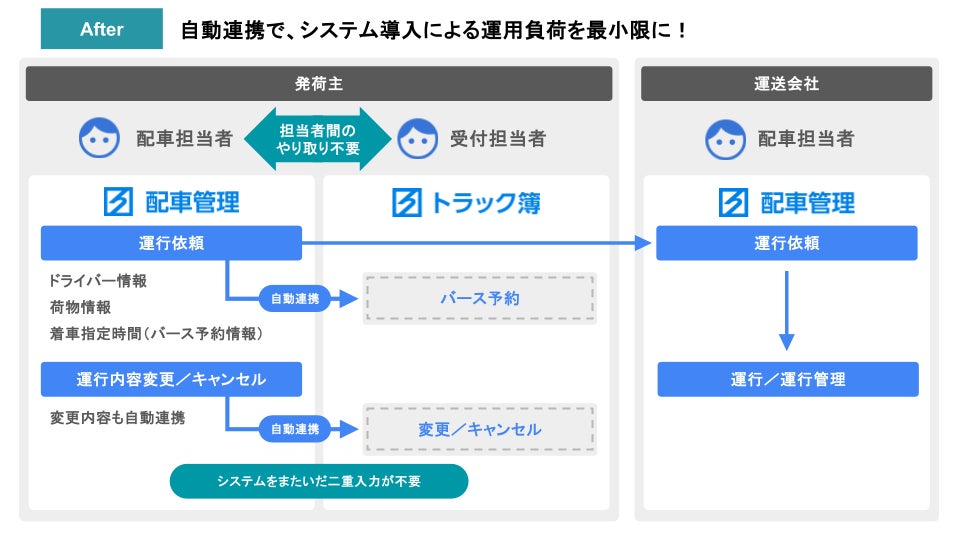 本連携により、配車システム「ハコベル配車管理」で作成した運行依頼情報(ドライバー情報、荷物情報、着車指定時間など)が、自動でトラック予約/受付システム「トラック簿」に登録され、これまで発生していた二重作業が不要となります。