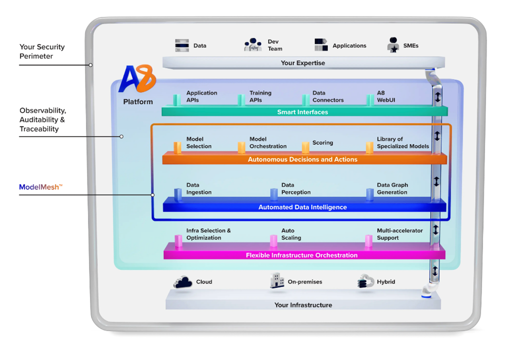 Articul8が提供する自律型生成AIプラットフォームは、数千以上のLLMから目的に応じた最適なモデルを自動で選択して組み合わせる「Model MeshTM」というArticul8の技術に基づき、生成する文章や画像、音声などのそれぞれに最も評価の高いモデルを選択することで、回答精度の大幅な向上を実現します。また、回答に至ったプロセスや根拠を視覚化することで結果の「解釈可能性」も担保しています。