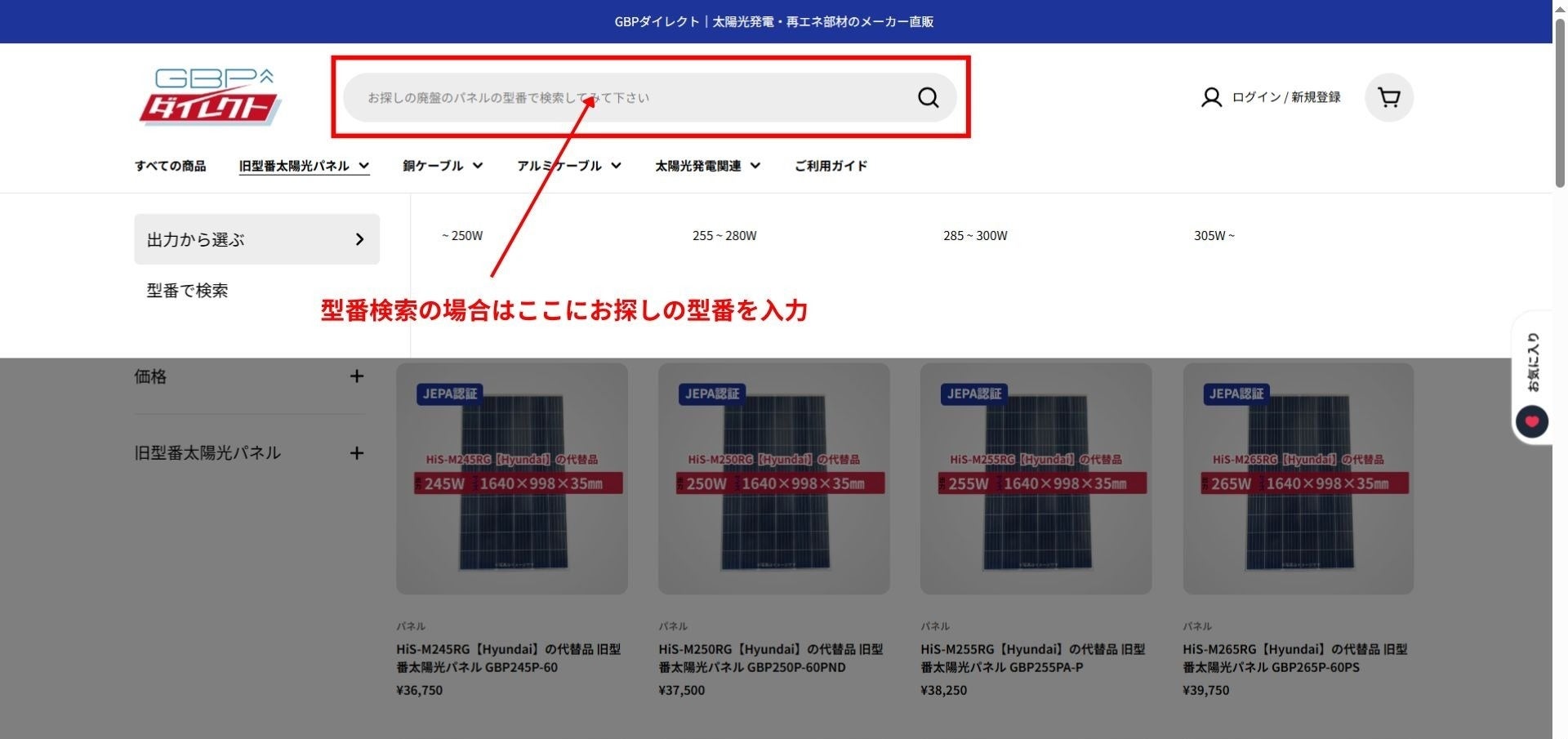 GBPダイレクトのページ上部の検索欄に、お探しの型番を入力して検索します。