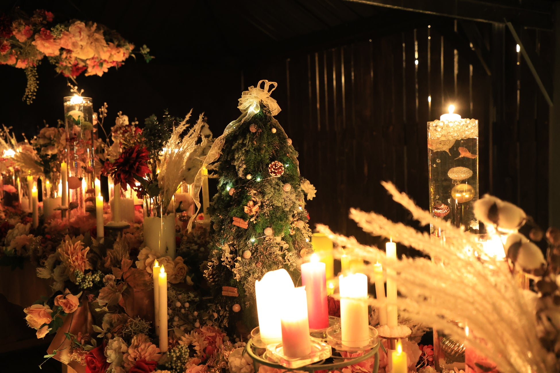 テーブルコーディネートをテーマに花と生火のキャンドルを組み合わせた華やかな展示スポット「花々の祝福」では、11月とは違ったクリスマス装飾に模様替えをしています。