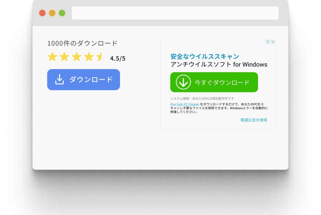 例えば、次の画像を見てください。同じサイトに「ダウンロード」と書かれた似たデザインのボタンが2つあります。1つは本来のダウンロードページに移動するボタンですが、もう1つはダウンロードボタンに見せかけた広告です。このように、広告と本来のボタンが区別しにくいデザインは「再生ボタン詐欺」とも呼ばれています。