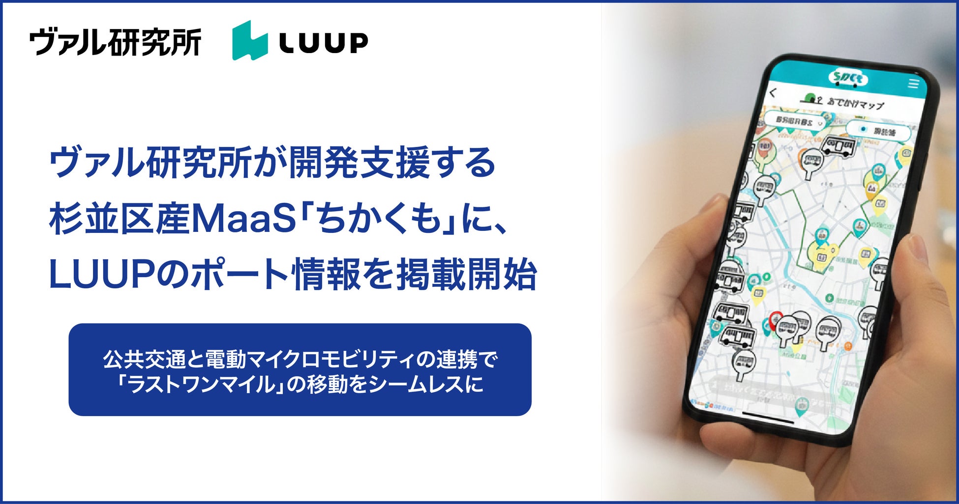 株式会社ヴァル研究所(本社:東京都杉並区、代表取締役:菊池 宗史、以下:ヴァル研究所)と、電動マイクロモビリティのシェアリングサービス「LUUP」を運営する株式会社Luup(本社:東京都品川区、代表取締役CEO:岡井 大輝、以下:Luup)は、ヴァル研究所が開発支援を行う杉並区産MaaS「ちかくも」において「LUUP」のポート情報を連携し、12月18日(木)より掲載を開始することをお知らせします。