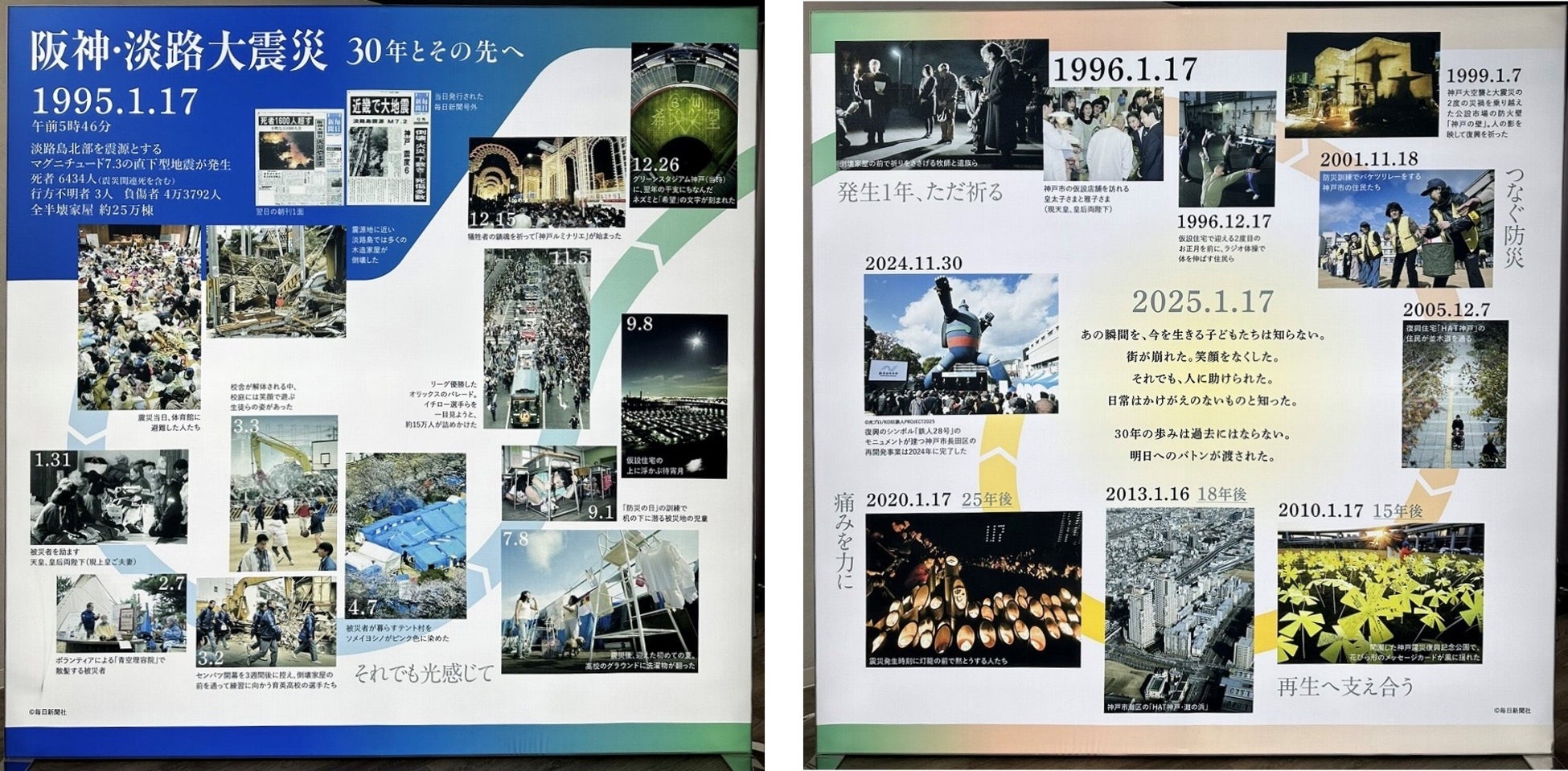 1995年1月17日に発生した阪神・淡路大震災から今年で30年となります。日本の観測史上初めて震度7を記録し、戦後初の大都市直下型となった大震災では、甚大な被害と共に多くの尊い命が失われました。展示では、毎日新聞社の写真データベース「毎日フォトバンク」の所蔵するアーカイブ写真の一部を時系列で紹介しています。今回採用されたルーファスは計3点で、UR都市機構のこれまでの取り組みを紹介したパネルほか、毎日新聞社が撮影した被災当時の様子や復興への歩みを紹介した大パネル(2m×2mを2台連結)です=写真。阪神・淡路大震災の記憶を次世代に継承する一助として、ご覧いただければ幸いです。