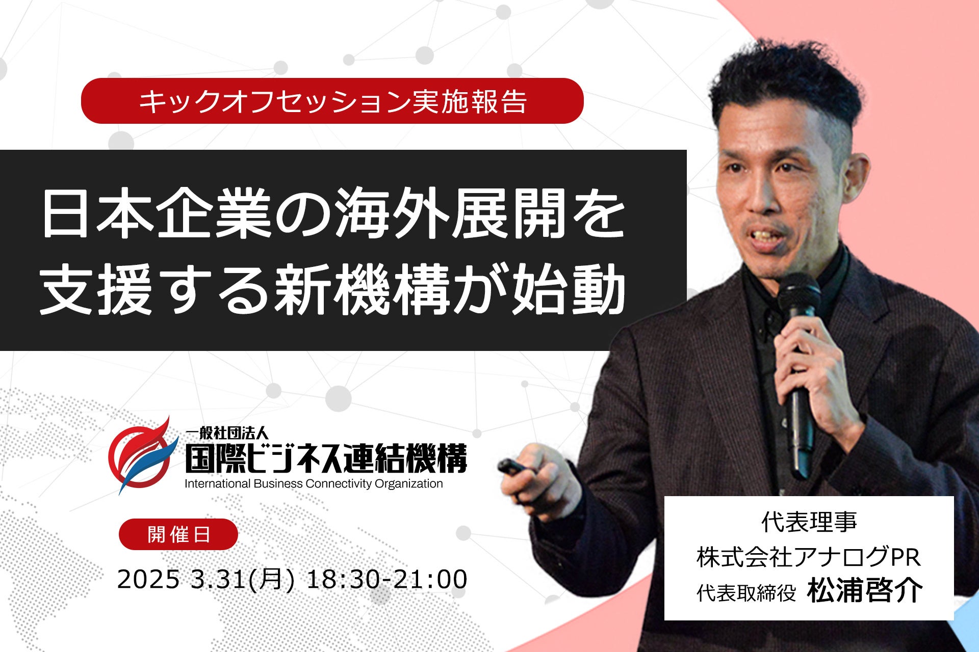 「企業の情報と印象をデザインする」をコンセプトに掲げ、メディアとWEBとオフラインを融合させたマーケティング戦略を提供する、株式会社アナログPR(本社:東京都港区、代表取締役:松浦啓介)は、2025年3月31日(月)に開催された、一般社団法人・国際ビジネス連結機構のキックオフセッションに、当社代表の松浦が代表理事として登壇したことをお知らせいたします。