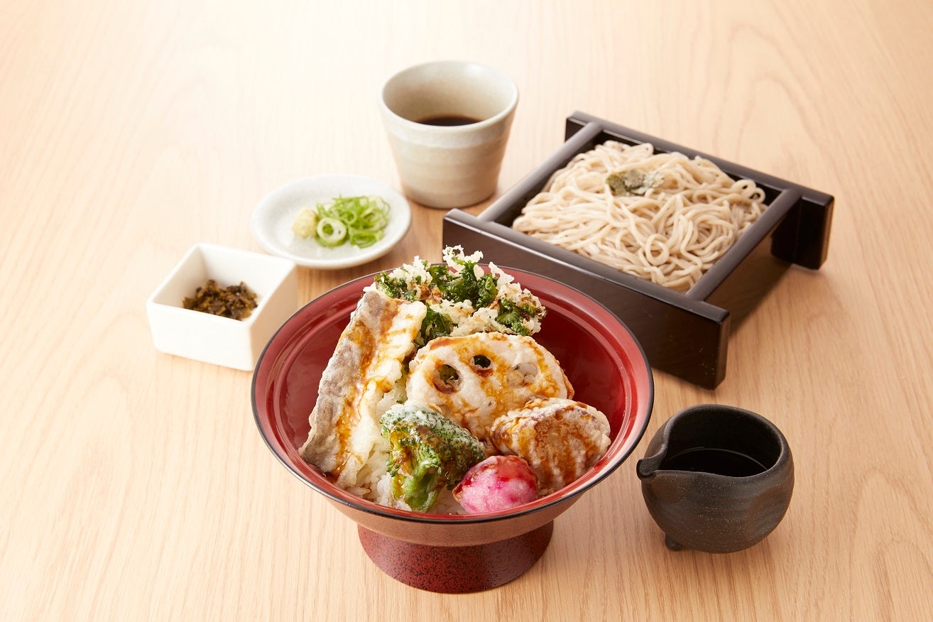 九州の食材を天丼でご用意しております。セットの麺は、ミニかけそば・ミニざるそばをお選びいただけます。