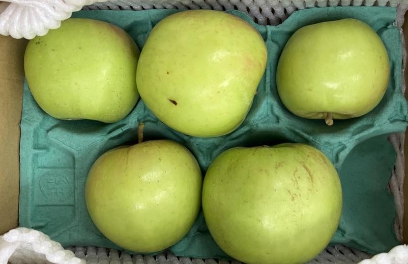夏の猛暑の影響で、野菜の収穫量が激減し、さらに上の写真のような規格外野菜が増えています。写真のピーマンは、猛暑のため赤く変色しています。下の写真のりんごは、通常であれば赤く色づくのですが、やはり猛暑の影響で緑色のままです。