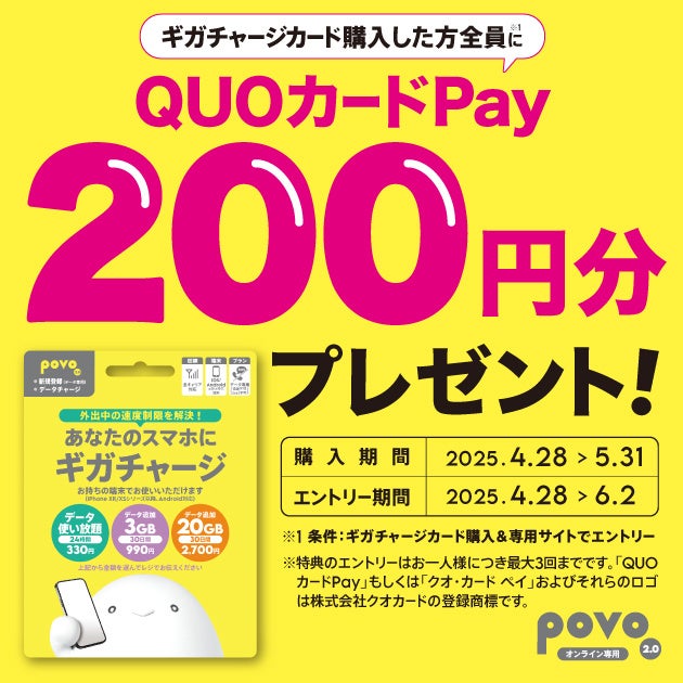 2025年4月28日から5月31日まで、全国のローソンでギガチャージカードを購入するとQUOカードPay200円分がもらえるキャンペーンを開催します。「使い放題(24時間)330円」「3GB(30日間)990円」「20GB(30日間)2,700円」すべてが対象のおトクなキャンペーンです。